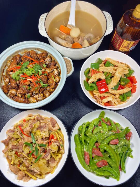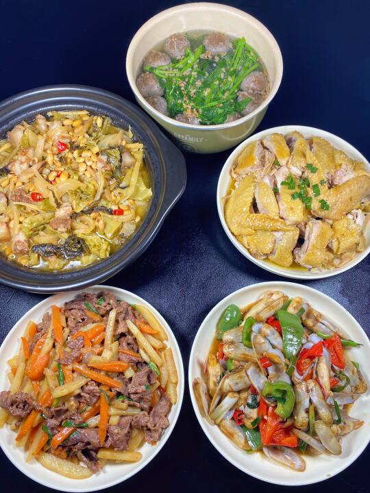 爆炒蛏子|牛肉炒胡萝卜土豆丝|五花肉酸菜苦瓜煲|盐焗鸡|西洋菜牛肉丸汤