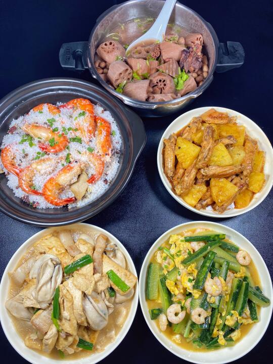 菠萝鸡翅|盐焗罗氏虾|虾仁鸡蛋炒青瓜|生蚝焖豆腐|莲藕花生猪骨汤