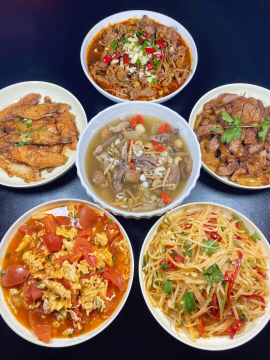 水煮牛肉|苹果炖猪排|炝拌土豆丝|香煎鹦哥鱼|太子参猪心汤|西红柿炒鸡蛋|炸猪油