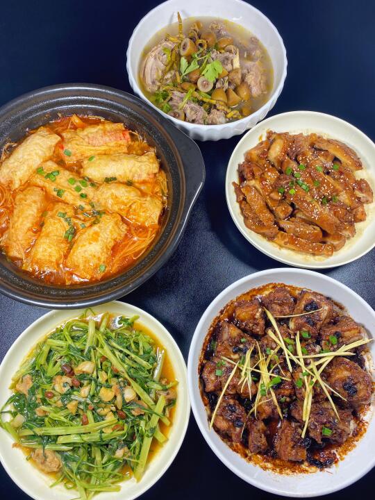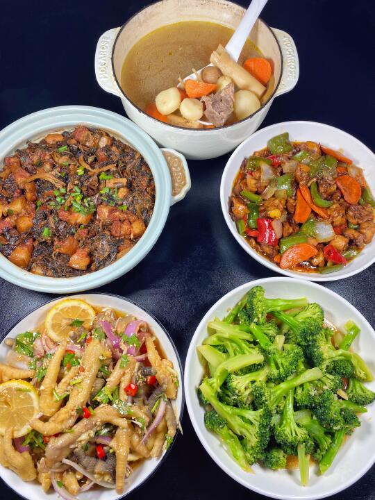 黑椒鸡腿肉|蒜蓉西兰花|马蹄百合甘蔗猪骨汤|梅干菜焖五花肉|柠檬鸡爪