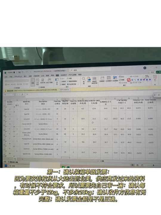 因为要安排把货从大陆出到北美,供应商发过来的资料,有时候不符合要求,所以需要先自己审一遍:确认每箱重量不少于12kg,不多余23kg;确认收件方信息有无完整;确认发票金额是不是正确。