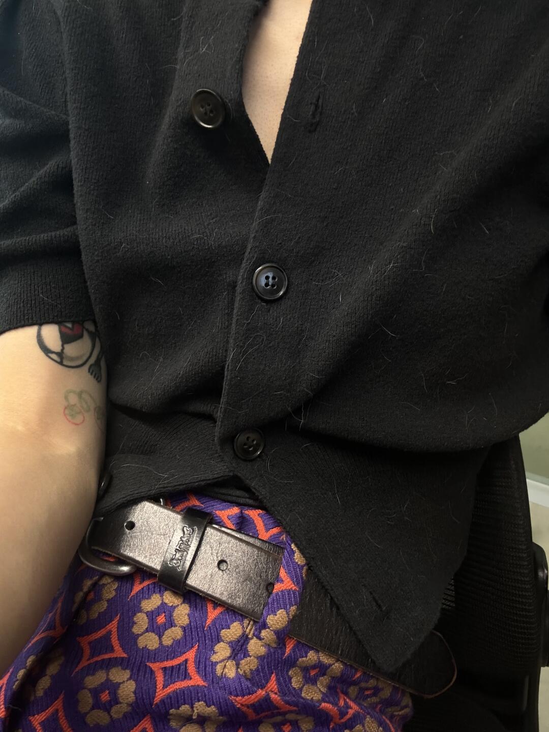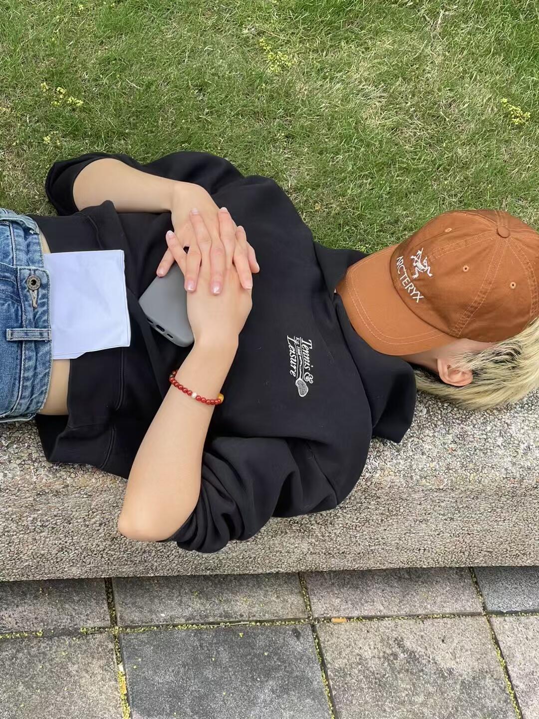 T恤里面套针织 头顶上面盖彩帽 皮扣腰间上戴 造型细节都在