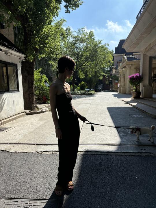 裸色斜肩裙,真的是清爽又不费力的好看。突然很想试试不靠多余装饰、只靠剪裁说