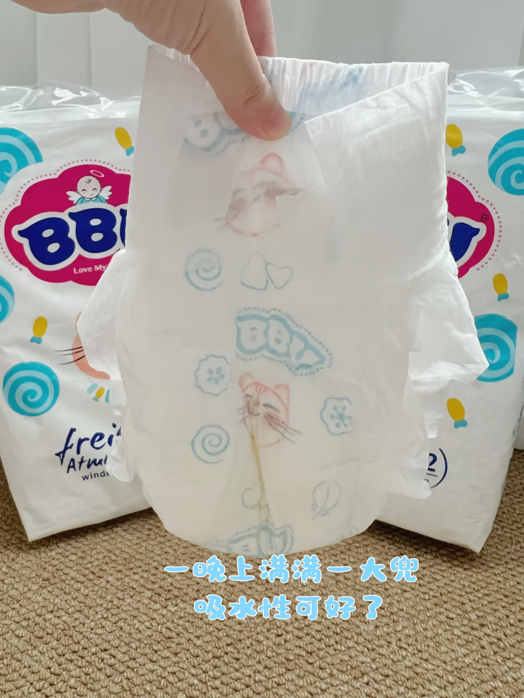 天知道找到一款合心意的尿不湿有多难!尤其现在这天气,热得娃动不动就一身汗,之前用的那款总像给宝宝裹了层塑料布,半夜摸起来潮乎乎的,小屁屁红得让人心疼,他睡不安稳,我也得起来换好几次,黑眼圈都快垂到地上了… 直到闺蜜把这款塞给我,简直像打开新世界!薄薄一片才1.9mm,摸起来软fufu的,贴在手上都感觉透气,给娃穿上像没穿一样,小粗腿随便蹬也不勒。 最惊喜的是晚上!以前总担心漏尿,现在双层腿围把肉肉都兜得稳稳的,超能吸的芯体一晚上下来还是干爽的,早上起来小屁屁白白嫩嫩,娃能从天黑睡到天亮,连哼唧都少了。 终于体会到整觉的快乐了!不用半夜爬起来换尿布,早上看着宝宝睡饱了笑出小奶膘,这大概就是当妈最治愈的瞬间吧~ 夏天带娃的姐妹,这本命屁粮真的可以冲!BBu 纸尿裤