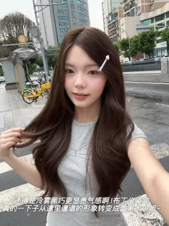 颜色整体是自然的棕黑色,有一些巧克力深棕色调调,妈生好发色的感觉~一点也不沉闷显假!头发染完也是柔顺又有光泽感~发质显得超级好!真的太爱了!!