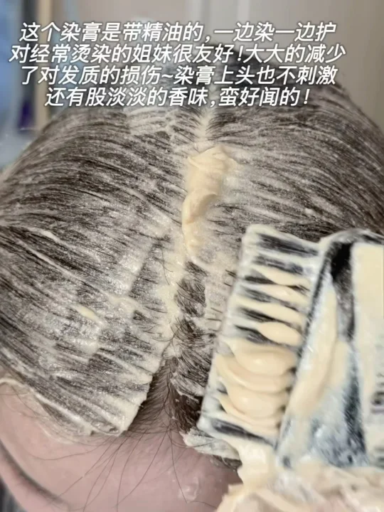 这个染膏是带精油的,一边染一边护,对经常烫染的姐妹很友好,大大的减少了对发质的损伤~染膏上头也不刺激,还有股淡淡的香味,蛮好闻的!新手染发也很友好~不会染也有一对一指导的