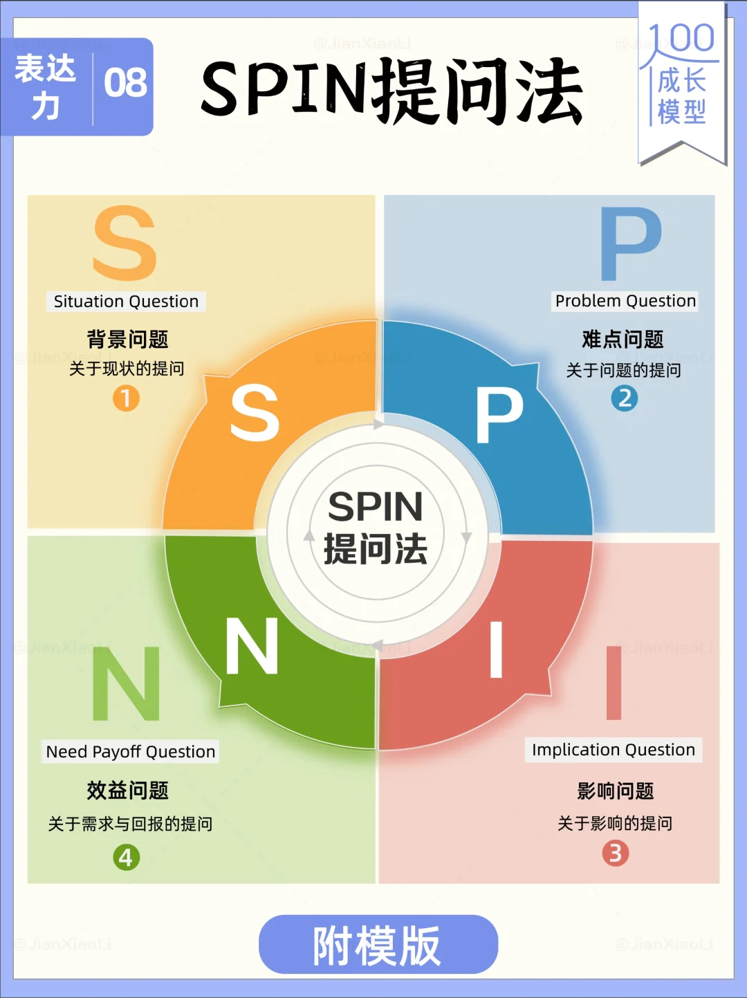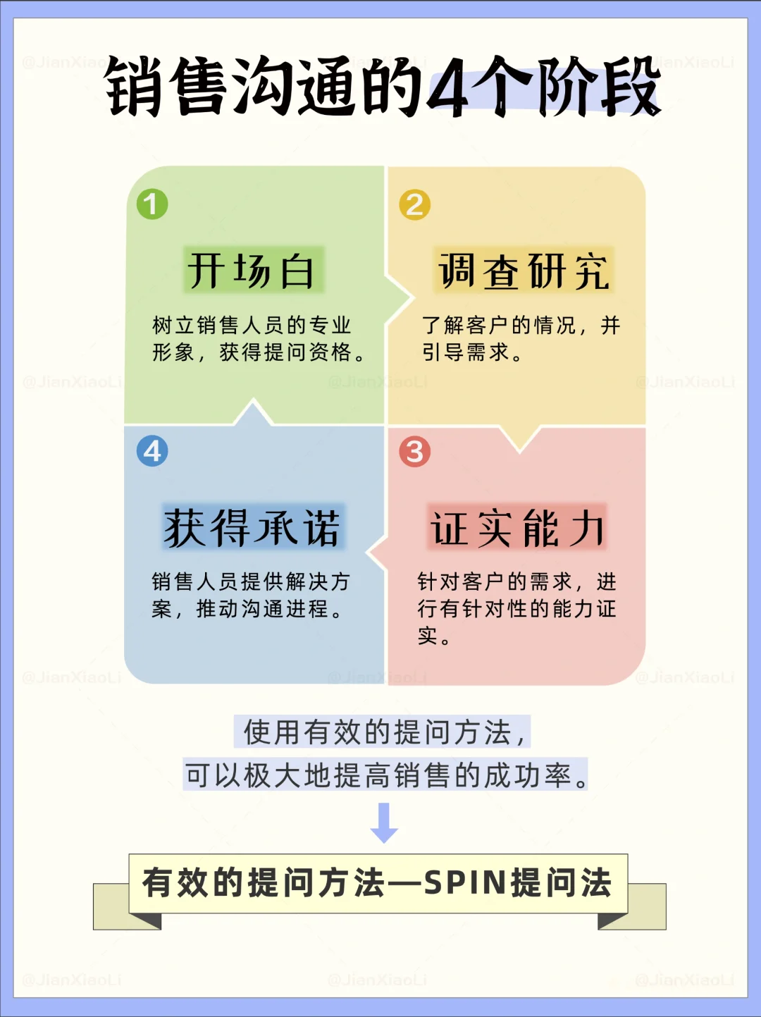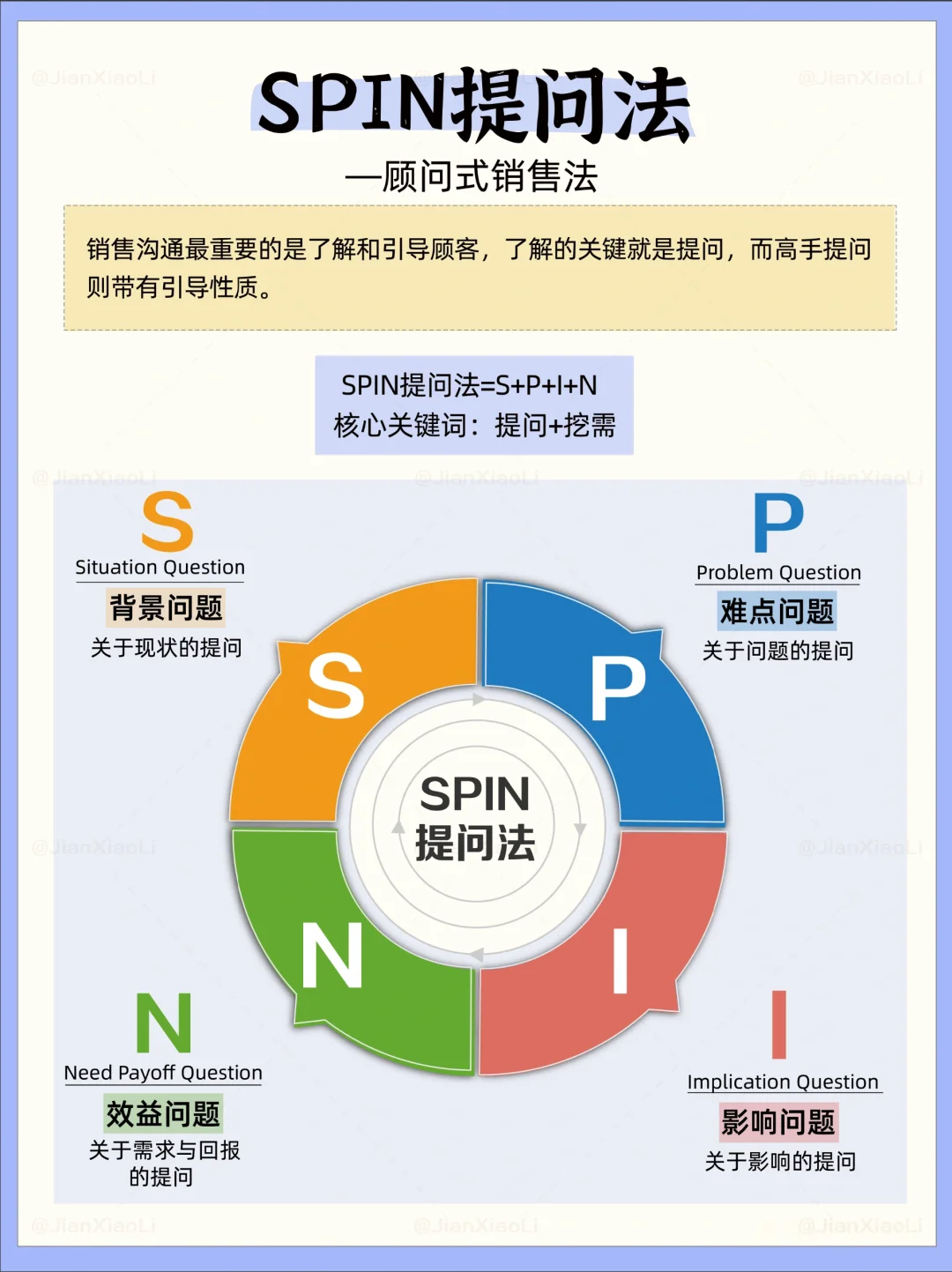 “一个好问题,比答案更重要。”💬 通过有效提问,可以深入挖掘客户的真实需求👩🏻💻 有效的提问方法—SPIN提问法👏 S—背景问题:关于现状的提问 P—难点问题:关于问题的提问 I—影响问题:关于影响的提问 N—效益问题:关于需求与回报的提问