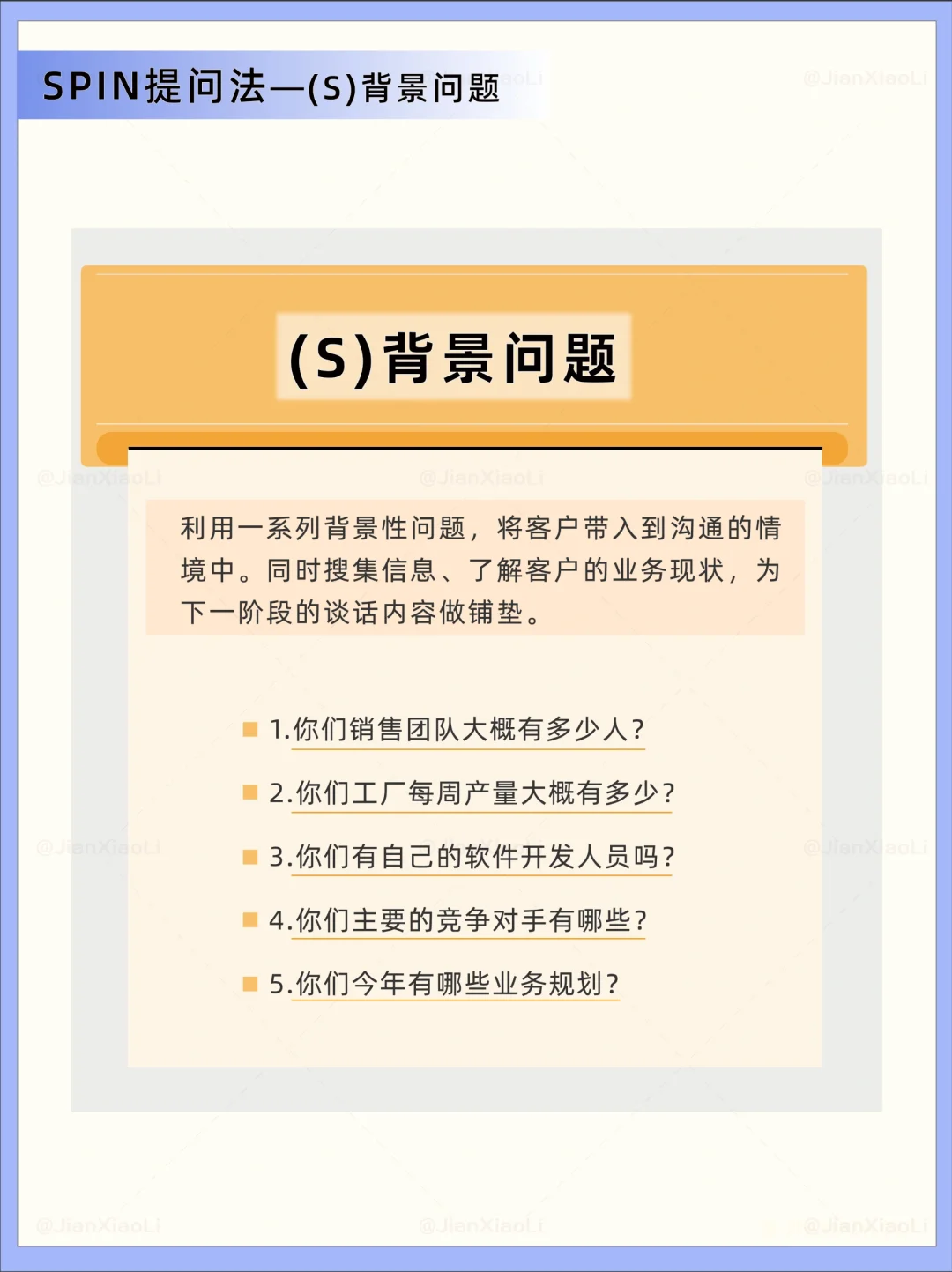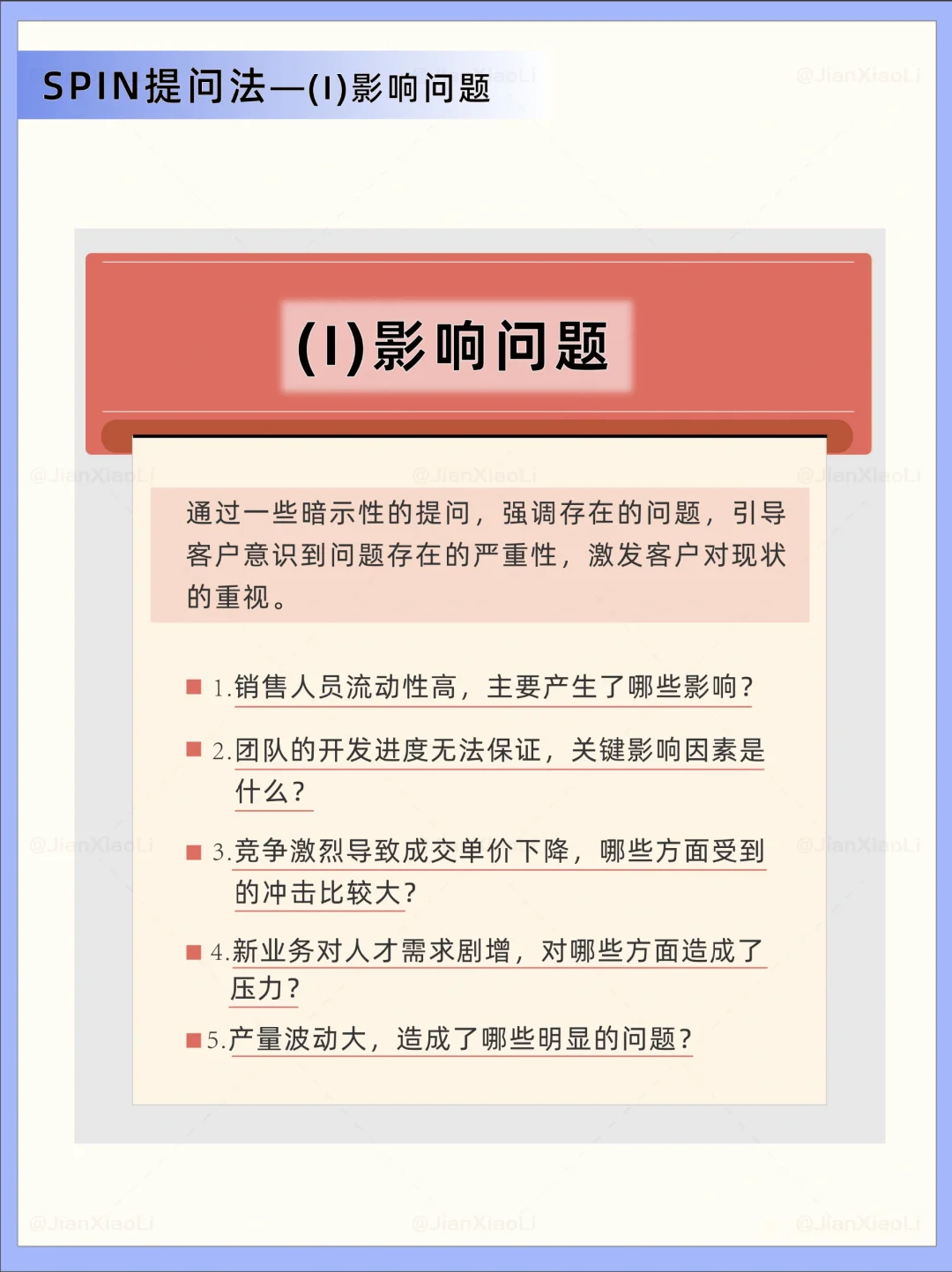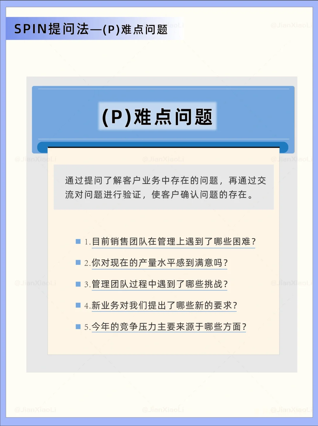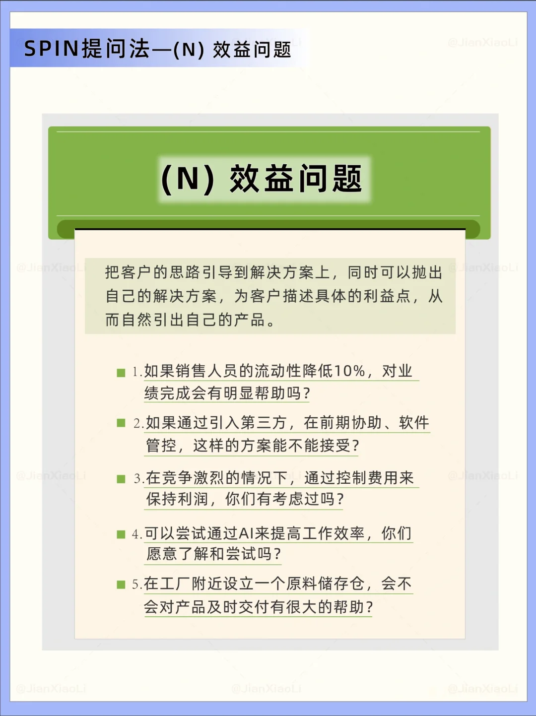 “一个好问题,比答案更重要。”💬 通过有效提问,可以深入挖掘客户的真实需求👩🏻💻 有效的提问方法—SPIN提问法👏 S—背景问题:关于现状的提问 P—难点问题:关于问题的提问 I—影响问题:关于影响的提问 N—效益问题:关于需求与回报的提问