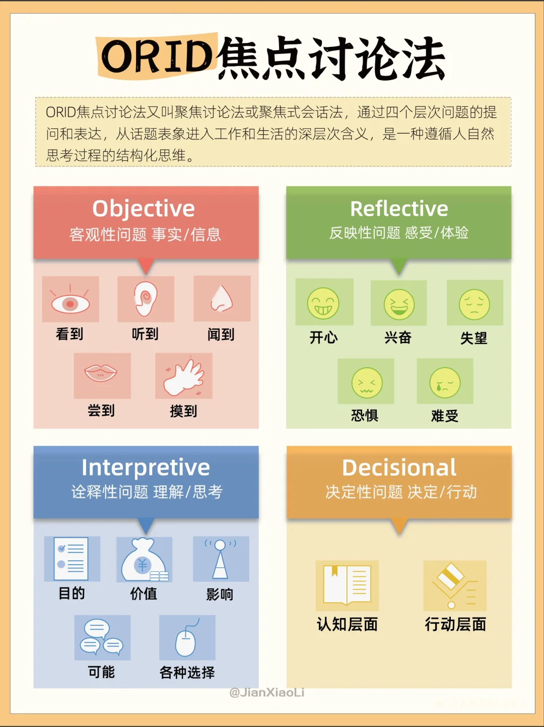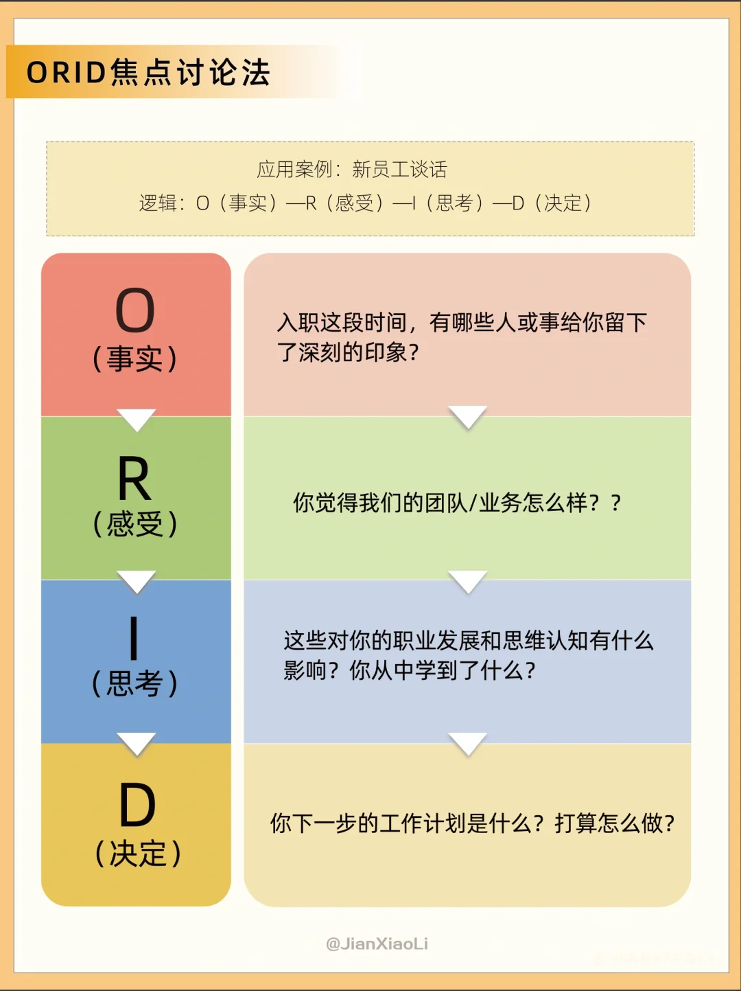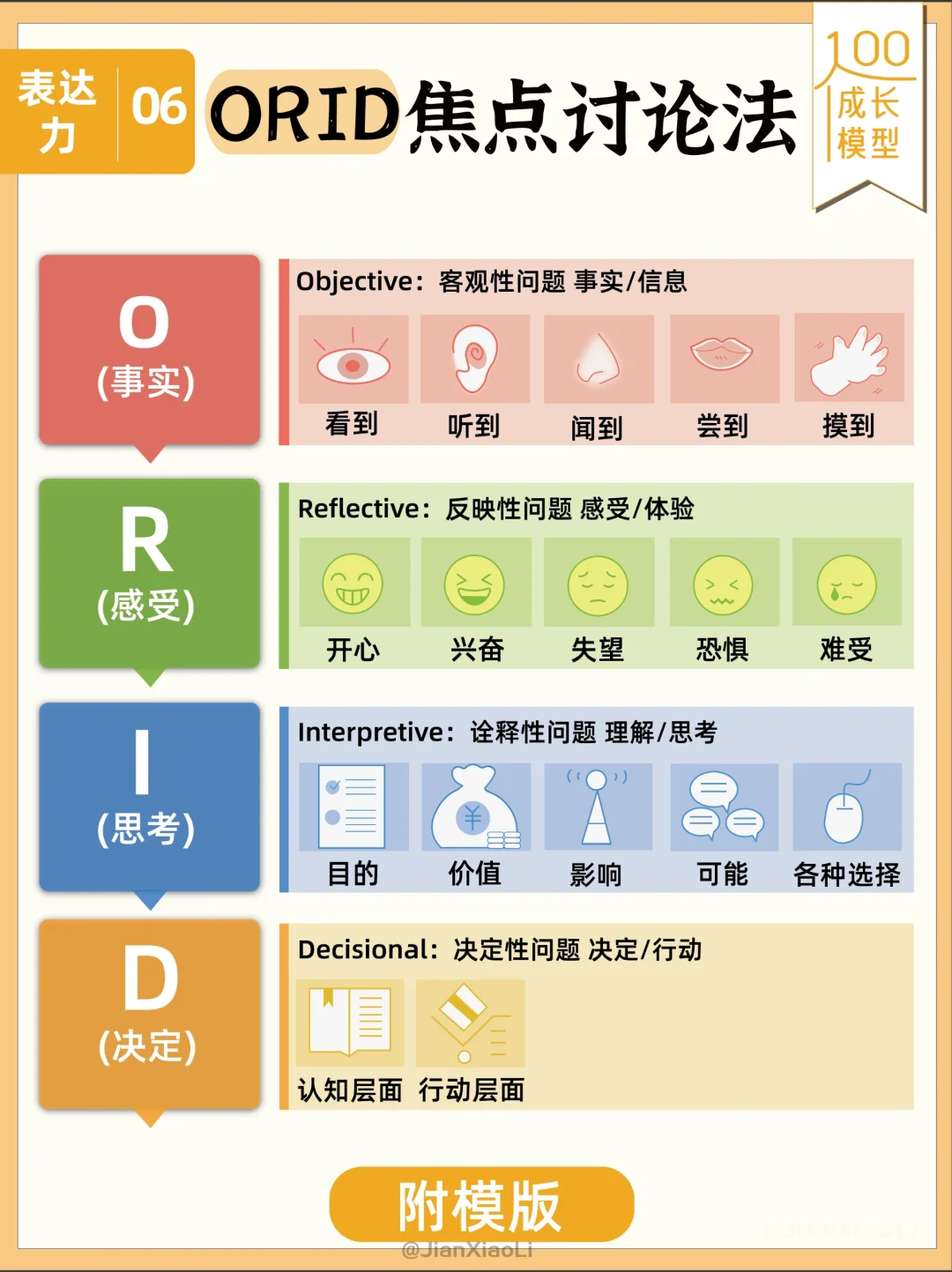 和别人沟通的时候说话没有重点?💬 很想提问题,但不知道怎么提出问题?🤔 推荐ORID焦点讨论法👇 通过四个层次问题的提问和表达触及根本 O:Objective 客观性问题 事实/信息 R:Reflective 反映性问题 感受/体验 I:Interpretive 诠释性问题 理解/思考 D:Decisional 决定性问题 决定/行动