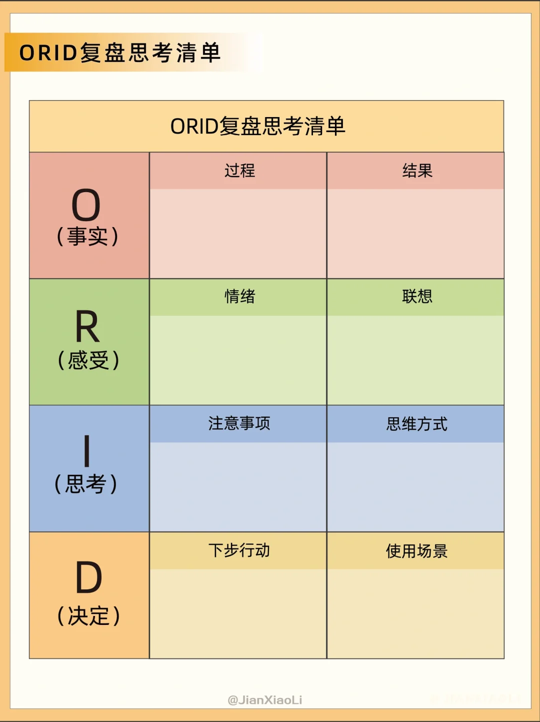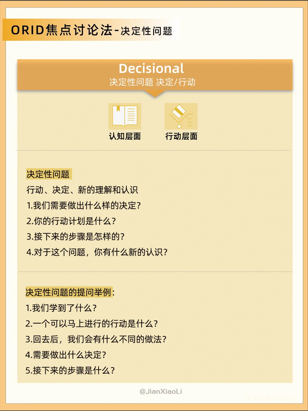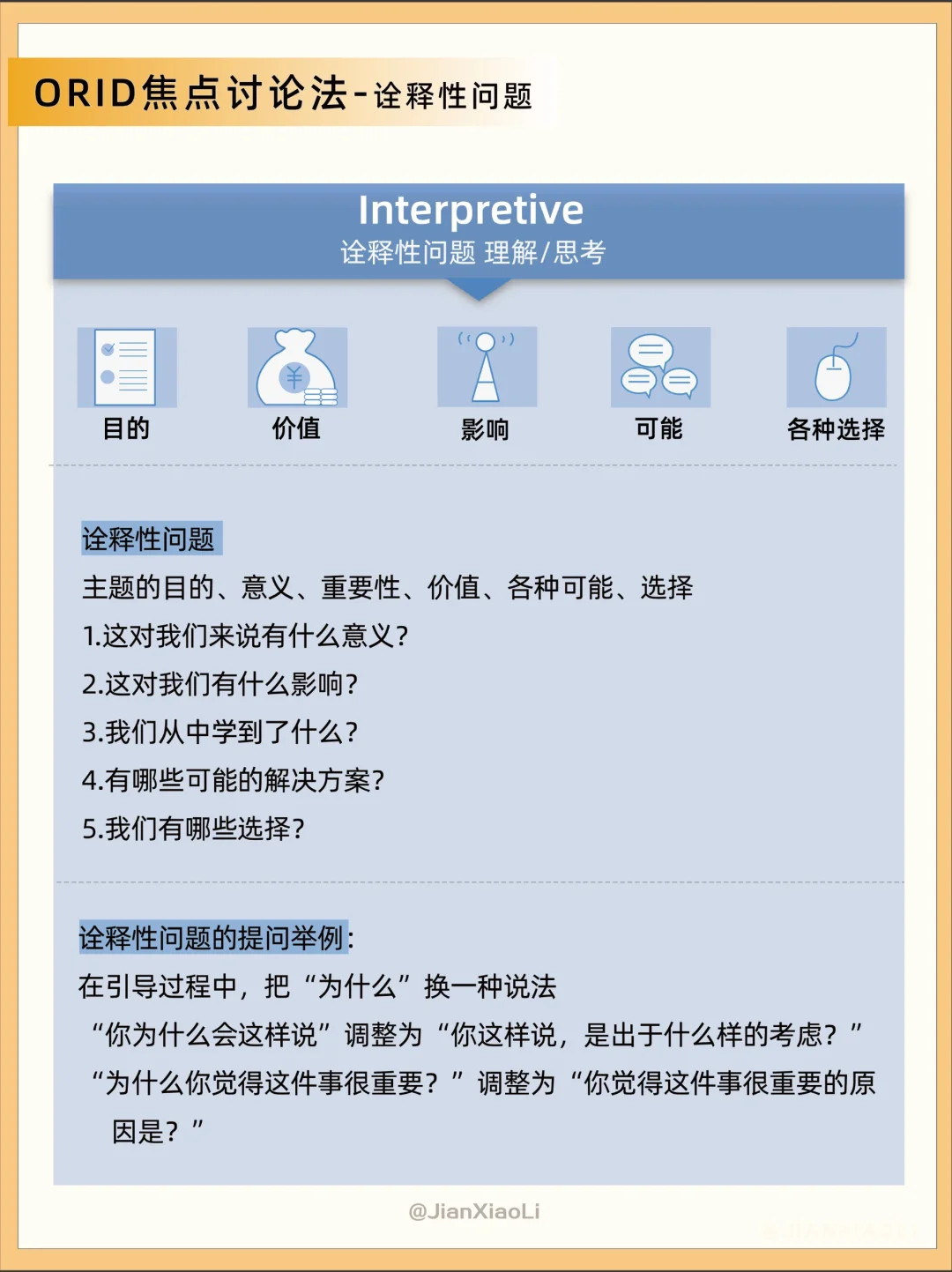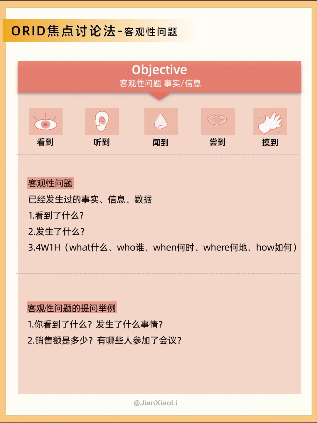 和别人沟通的时候说话没有重点?💬 很想提问题,但不知道怎么提出问题?🤔 推荐ORID焦点讨论法👇 通过四个层次问题的提问和表达触及根本 O:Objective 客观性问题 事实/信息 R:Reflective 反映性问题 感受/体验 I:Interpretive 诠释性问题 理解/思考 D:Decisional 决定性问题 决定/行动