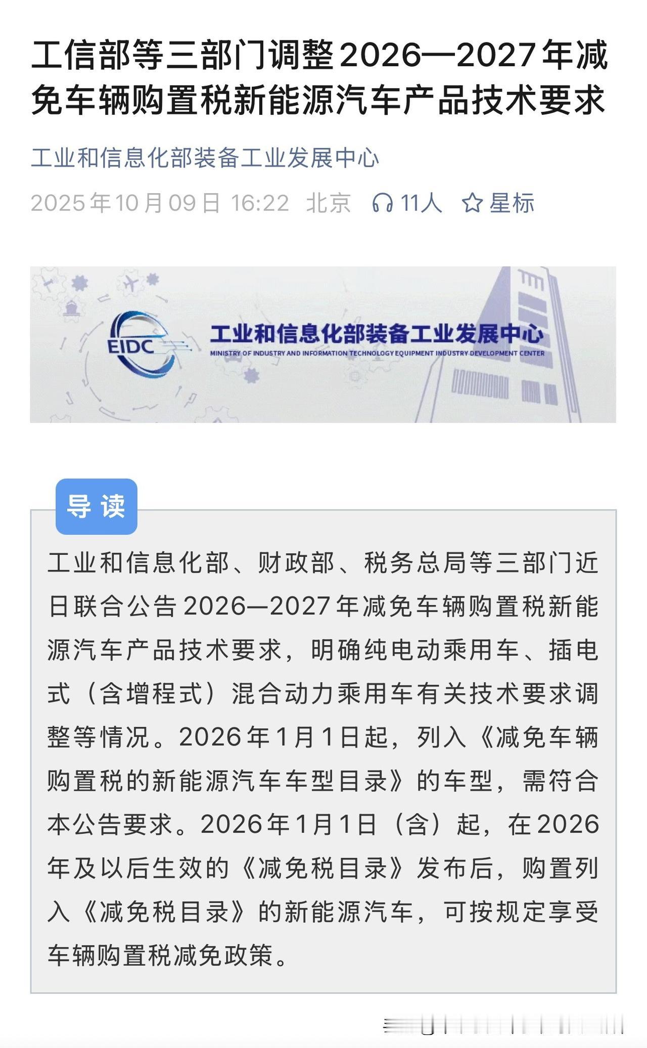 最近工信部出了一个文件,是关于2026~2027年减免车辆购置税新能源汽车产品技