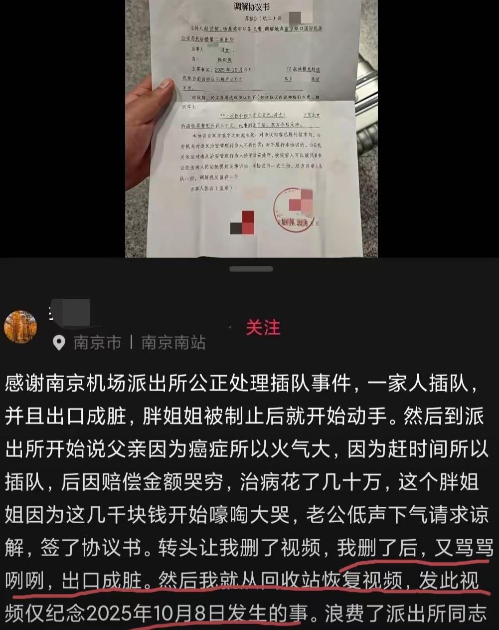 南京禄口机场乘客阻止插队被扇耳光,还有后续。 被打当事人出来说了,报警后经过调解,对方已道歉,除了补偿3500元之外,还赔偿了500多的高铁费用。 前提是把视频删了,被打者一时心软同意了,谁知刚删了视频,动手的那一家就翻脸,又开始出口成脏乱骂人,当事人一气之下又把视频恢复了。 打人者那男的只是骂人,动手的是同行的那个胖女子(猜测是夫妻),力气够大,两耳光把人都给扇翻在地。 调解室是她低三下四的说,父亲因为癌症治疗花了十几万,火气大,一时没控制住自己情绪,但听到要赔偿之后,就开始哭哭啼啼,赔偿完了就变脸。 插队骂人动手打人,完全可以定性为寻衅滋事,让赔3500道歉和解,已经是处罚中最轻的了,不知悔改出尔反尔,让人鄙视,还一家子人“围攻”别人,真是不是一家人不进一家门。 插队冲突 机场怒斥