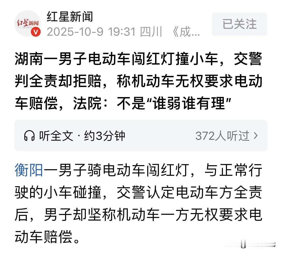 湖南衡阳,男子骑电动车闯红灯,和一正常行驶的汽车相撞,事后交警认定男子全责,车主就让男子赔自己4800块的修车钱,结果男子说,你以为我不懂法?电动车撞机动车产生任何财产损失都不用赔!车主也不废话,直接诉至法院,法官一句话怼得男子哑口无言。 今年5月的一天,刘航骑着他的电动车顺着一条路往南走。 到了一个路口,红灯亮着,可刘航却没停,直接冲了过去。这一冲,正好赶上王宇开着小轿车在路口左转。 只听哐当一声,刘航的电动车前头和王宇的汽车左前侧怼了个正着。刘航当场摔倒在地受了伤,两台车也都撞坏了。 事后,交警大队表示,刘航闯红灯是这起事故的全部原因,他负全责。小车司机王宇按规则行驶,一点责任没有。 后来,汽车车主王宇把车开到熟一家悉的汽车美容店,一番修理下来,微信付了4800块维修费。 钱花了,王宇自然去找负全责的刘航要这笔钱。没想到,刘航却一口回绝了赔偿。 刘航觉得,自己还受了伤呢!而且他记得有这么个说法,那就是非机动车撞了机动车,机动车一方受伤可能有赔偿,但财产损失,比如修车费,好像没硬性规定必须赔? 他觉得法律没明确说非机动车要赔机动车的财产损失,所以他不用赔。 王宇一看这架势,商量不成,那只能法庭见了,他就把刘航告上了法院。 案子到了法院。一审法官看了交警出具的《道路交通事故认定书》,认定这责任划分得清楚、程序也合规,完全能作为判案的主要依据。 法官分析事故原因,非常明确,那就是刘航闯红灯直接导致了王宇的车被撞坏。刘航的行为构成了侵权,他就应该赔偿王宇的全部修车损失。 对于刘航提出的那个“非机动车不用赔机动车财产损失”的说法,法院一点没留情面,直接说:这说法没法律依据!法院不支持。 所以,法院一审判决刘航必须赔偿王宇修车费4800元。 法官在判决书里还特别点了一句,说要是法院真按刘航那个说法判了,那以后非机动车闯红灯、乱穿马路的现象可能会更多! 对于那些故意违反交通规则,闯红灯影响交通安全,还造成别人受伤或者财产损失的行为,必须让他们承担该负的法律责任。 这样才能给全社会传递一个信号:守规矩,才有理! 刘航输了一审,心里不服气,觉得委屈,又上诉到了中级人民法院。 那么,从法律角度来看,二审法院会支持刘航吗? 《民法典》第1165条规定:行为人因过错侵害他人民事权益造成损害的,应当承担侵权责任。 在刘航交通事故案中,法院明确适用该条款认定责任。刘航闯红灯的行为存在明显过错,直接导致王宇车辆受损,符合“过错+损害+因果关系”的侵权责任构成要件。 尽管刘航自身受伤,但过错责任原则强调“谁过错,谁担责”,不因受害方身份,如非机动车驾驶人而免除赔偿责任。 《道路交通安全法》第76条规定:机动车与非机动车驾驶人、行人之间发生交通事故,机动车一方没有过错的,承担不超过百分之十的赔偿责任;有证据证明非机动车驾驶人、行人有过错的,根据过错程度适当减轻机动车一方的赔偿责任。 交警认定刘航负全责、王宇无责,符合该条款中“机动车无过错”的情形。 但法院结合《民法典》过错责任原则作出突破性的解释,那就是当非机动车一方存在重大过错,如闯红灯且为事故全部原因时,机动车方完全免责,非机动车方需承担全部赔偿责任。 如果仅因身份差异,比如“非机动车是弱者”就减免责任,反而会纵容“谁弱谁有理”的畸形价值观。 基于这个道理,中院最终驳回刘航的上诉,维持原判。刘航还是得赔王宇那4800元修车费。 这案子判下来,等于告诉大家,不管你是开车的还是骑车的、走路的,交通规则是红线。谁闯红灯谁担责,谁犯错谁赔偿。甭管你是“铁包肉”还是“肉包铁”,“谁弱谁有理”那一套,在法律的秤杆子上行不通。 错了就是错了,该赔就得赔! 有人说,这个法官才是正经法官,交警也非常给力! 也有人认为,闯红灯造成交通事故,肇事者除赔偿对方所有损失以外,应该对其拘留,闯红灯是违法行为造成事故就是故意行为,必须严惩。 在有红绿灯的情况下,电动车全责,在没有红绿灯的情况下,电动车主责,所以都要赔,有红绿灯的道路是按照交通法,没有红绿灯的道路是交警大队按照民法典来判的。现今社会,不是法盲越来越多,是心思不正的越来越多。 法不能向不法妥协,不能谁弱谁有理,短期看是非机动车要付出代价,让很多非机动车人员心理不爽,长期看让非机动车人员更加敬畏法律,减少违法减少更多、更大的人员伤亡,是保护了非机动车人员。不能鼠目寸光无限的保护非机动车人员的无理要求 对于这件事,你怎么看? 欢迎关注@一案一论