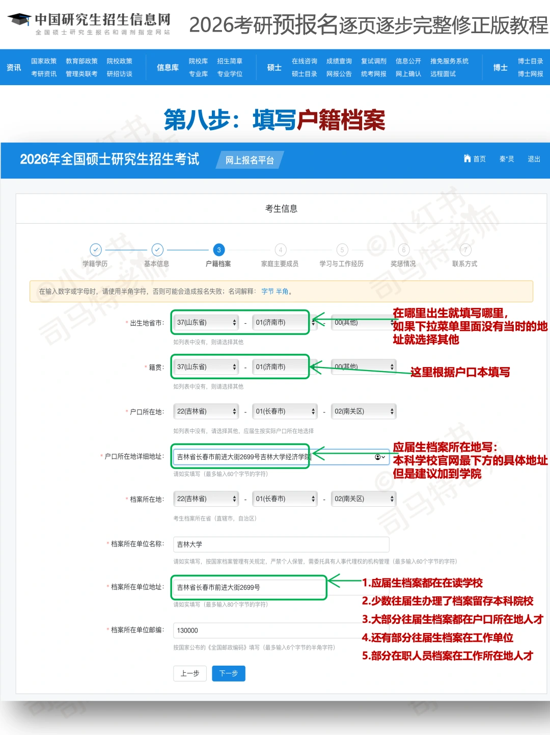 3. 户籍档案:户籍地填户口本首页地址,应届生档案填学校档案馆,往届生存人才市场的要问清具体地址,避免“找不到”问题。