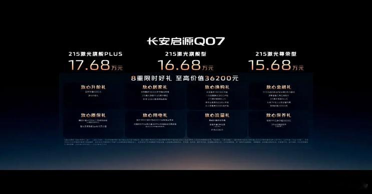 新车划重点新车情报局10月10日,长安启源Q07天枢智能驾驶辅助激光版正式上市,新车配备激光雷达,并采用地平线J6M芯片,算力可达128tops,支持高快领航、辅助泊车、安全辅助等功能。新车根据配置共推出3款车型,售价区间为15.68-17.68万元。
