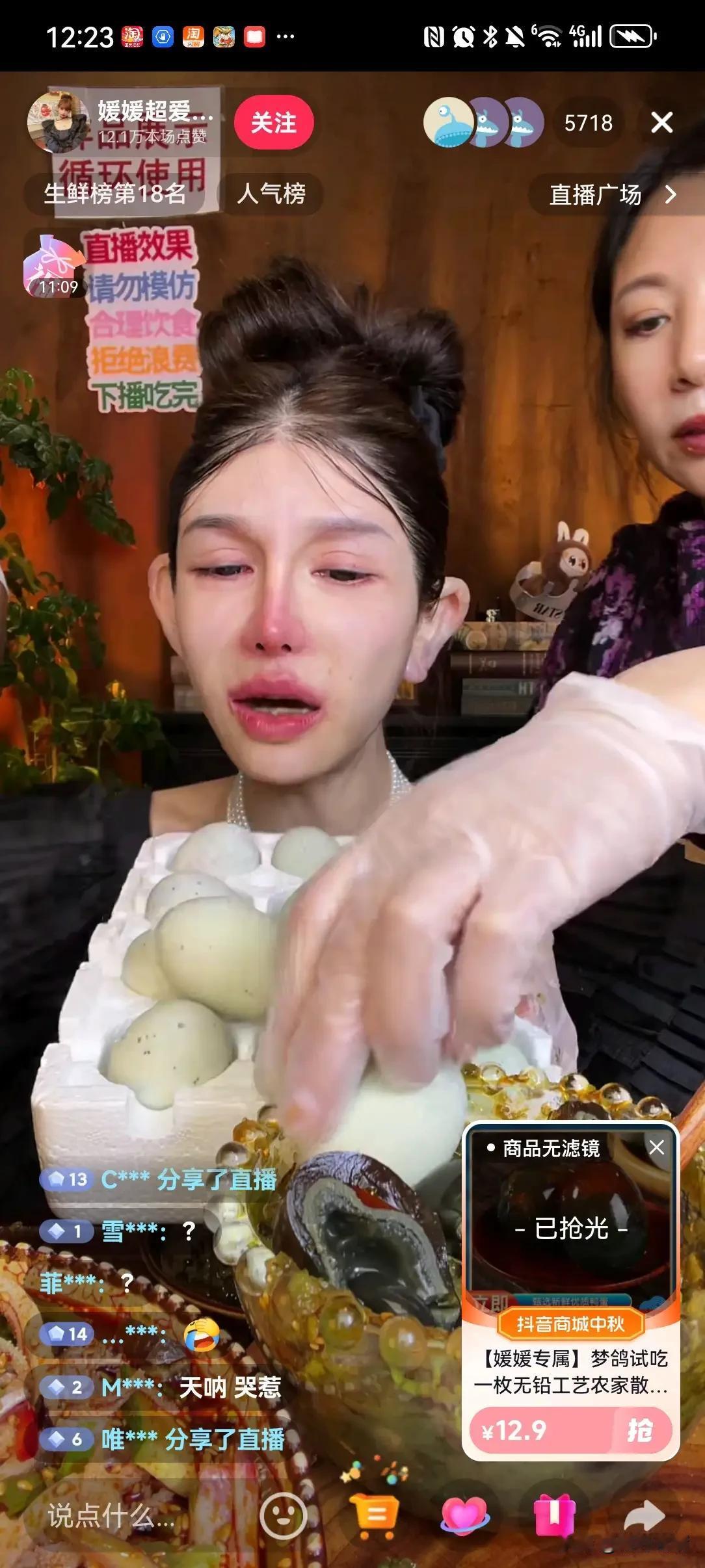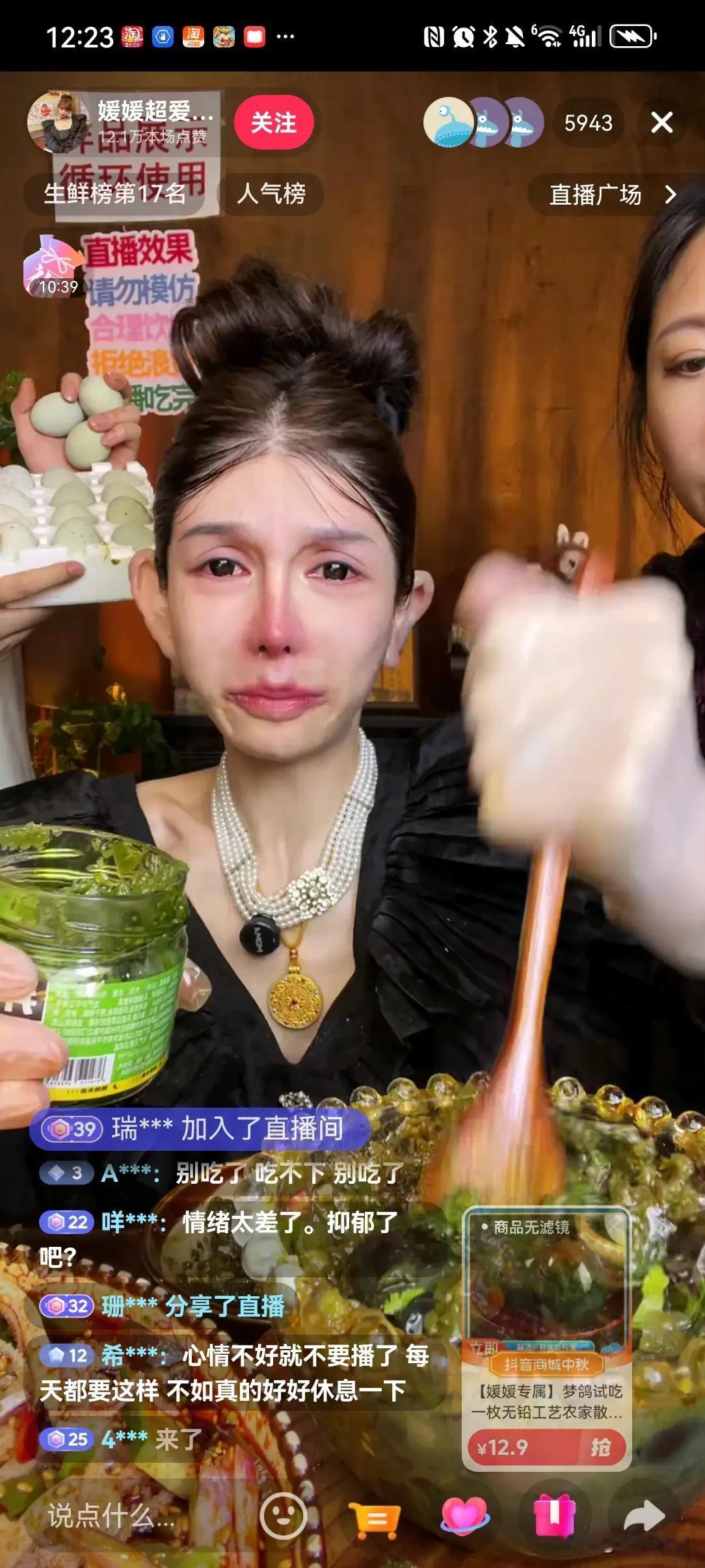 吃播变哭播, 主播媛媛在直播带货中, 情绪失控泪如雨下, 哭泣着介绍着产品, 鼻