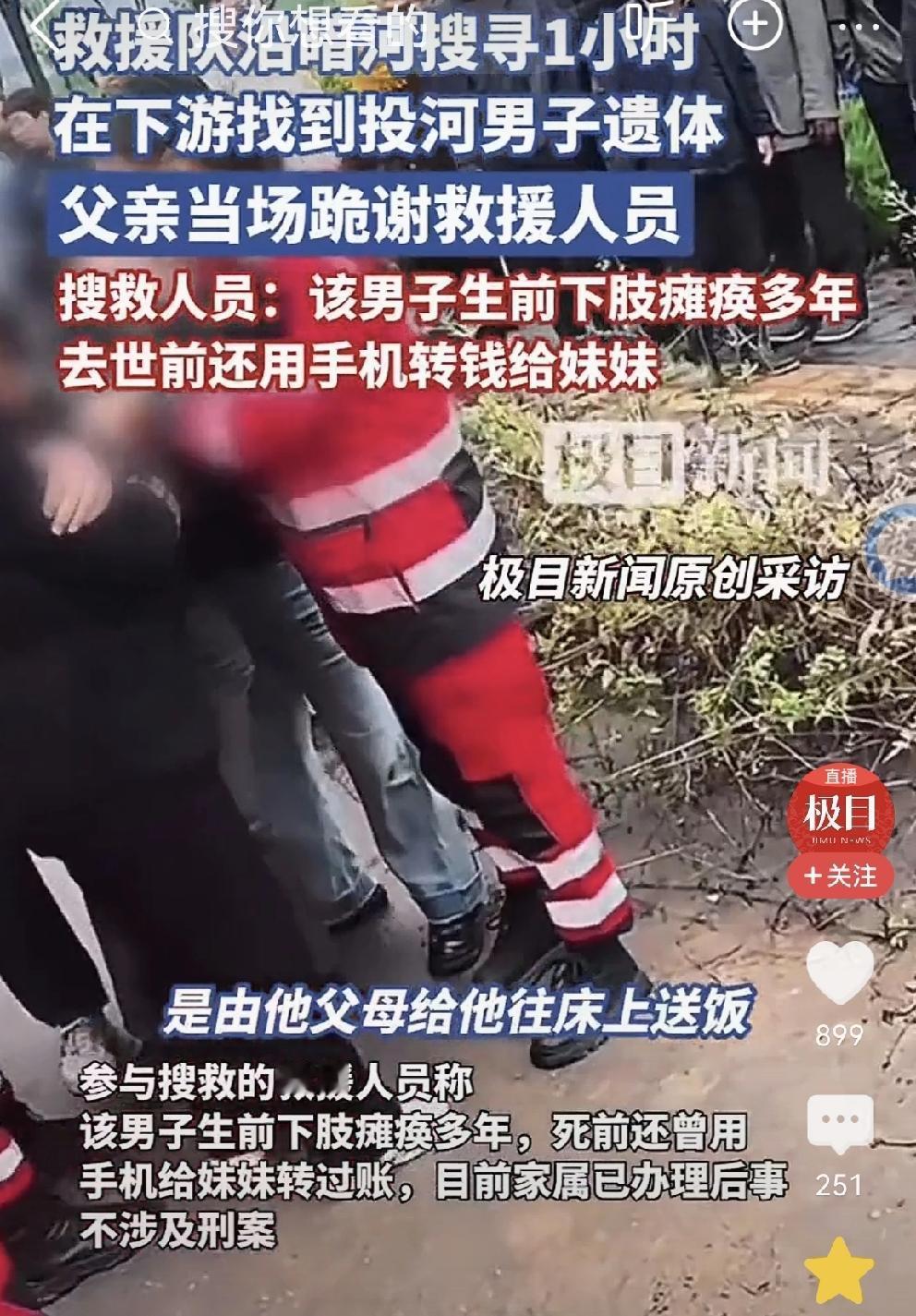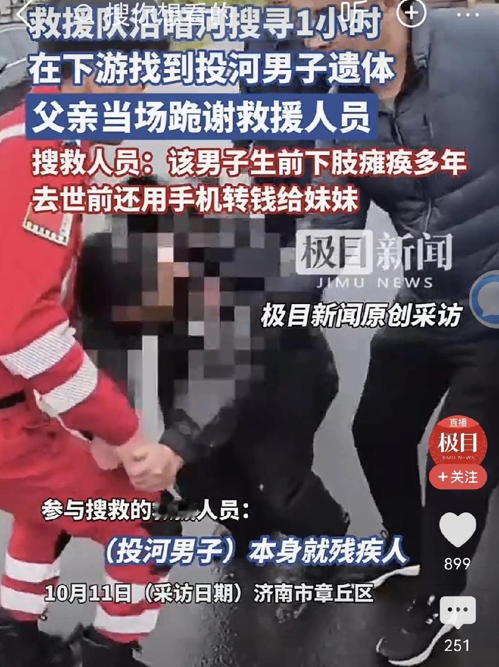 父亲跪地致谢救援队 这一幕真的看哭了[流泪][流泪][流泪][流泪] 济南市章丘区 一男子投河自尽,救援人员竭尽全力找到遗体。 老父亲见到儿子遗体的那一刻,眼泪滂沱,泣不成声,两手作揖,“谢谢!谢谢!”下跪救援队。 救援队员们,一把拉起老父亲。在场的人无不为之流泪。 据救援人员讲述: 男子下肢不能动,之前还可以拄拐勉强下地走路。最近,完全不能动。瘫在床上,吃喝拉撒都是父母照顾。 他把手机里的钱全部转给妹妹,就失去联系了。 老父亲下跪救援队的情景,刺痛人心。善良的老父亲,请你节哀[流泪][流泪] 男子真难,活着活受罪。生前,饱受病痛折磨,受尽了苦难,拖累了父母…心中太多的块垒! 这样走了,也许就是一种解脱! 祈祷:逝者安息,一路走好,但愿通往天堂的路上没有病痛折磨[祈祷][祈祷][祈祷]