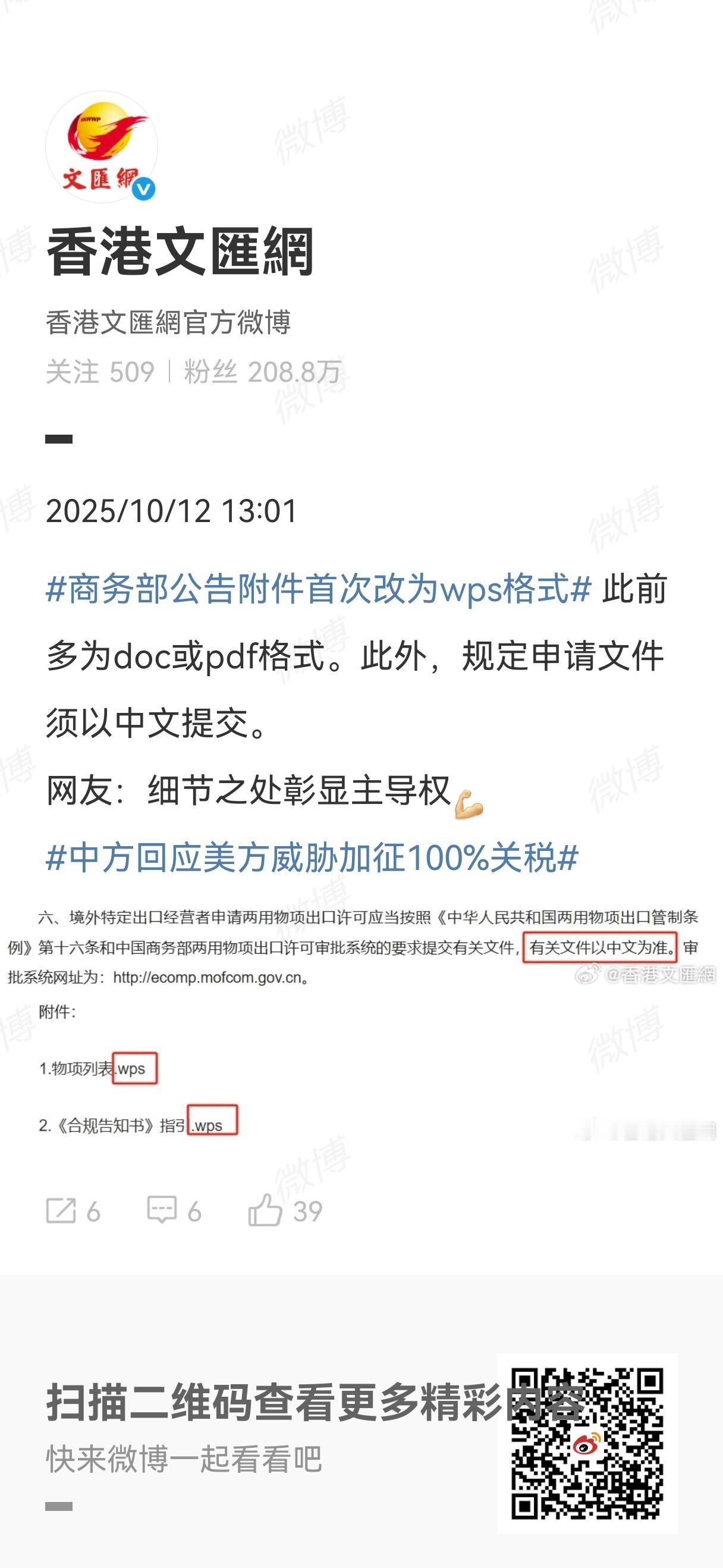 10月9日商务部发布2025年第61号公告,对含有中国成分的部分境外稀土相关物项实施出口管制。公告要求:有关文件以中文为准,并且公告的附件《物项列表》、《合规告知书》指引均为WPS格式。第61号公告发布后的两天之内,中文和WPS这两大元素成为网络话题,总结为一个热点就是“大家都要学中文、大家都要用中文”。