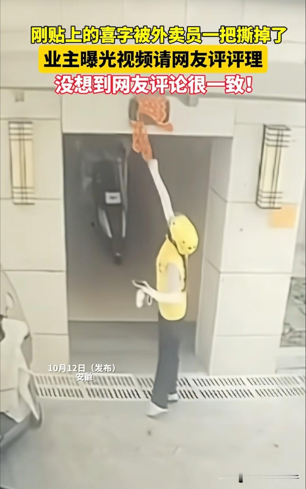 不是谁发视频谁有理!安徽某小区的一业主郁闷了,他结婚那天刚在单元楼门口贴的喜字就被人撕了,查监控看到原来是外卖员干的,于是他把视频发到了网上,想让网友评评理。 没想到却有不少网友指责他,说他喜字的位置贴的不对,只顾自己方便,挡着外卖员看单元楼号了,不把字撕开怎么知道是几号楼。 不过也有网友认为,虽然男子的做法欠妥,但是毕竟是人家大喜的日子,外卖员的做法也不恰当。 外卖员明明已经找到这栋楼了,只是确定一下楼号,完全没必要撕掉,还随手扔在地上,完全可以打个电话问下,这样破坏人家的好日子,有点缺德! 应该贴在旁边两个柱子上的,毕竟好事成双嘛,您觉得呢!