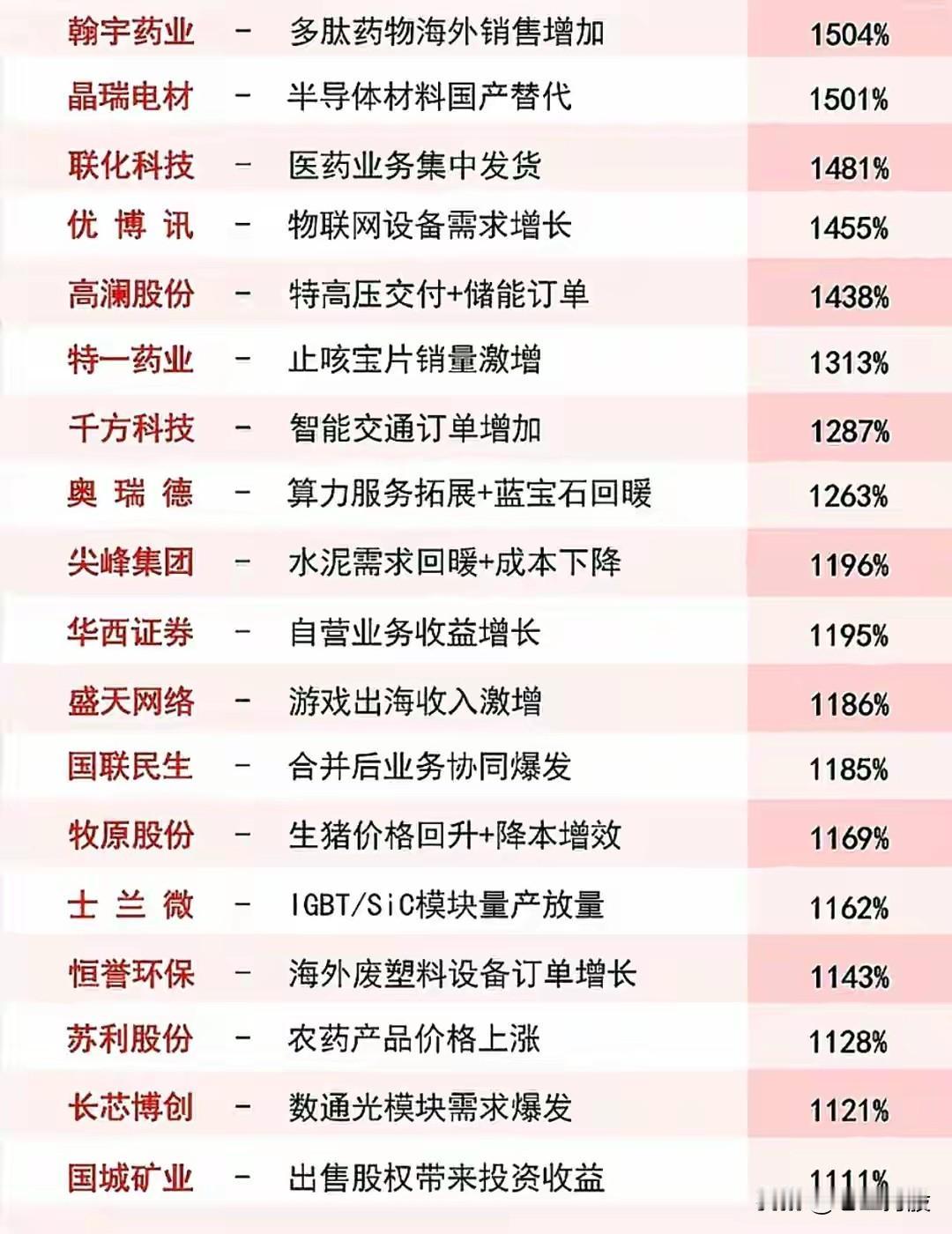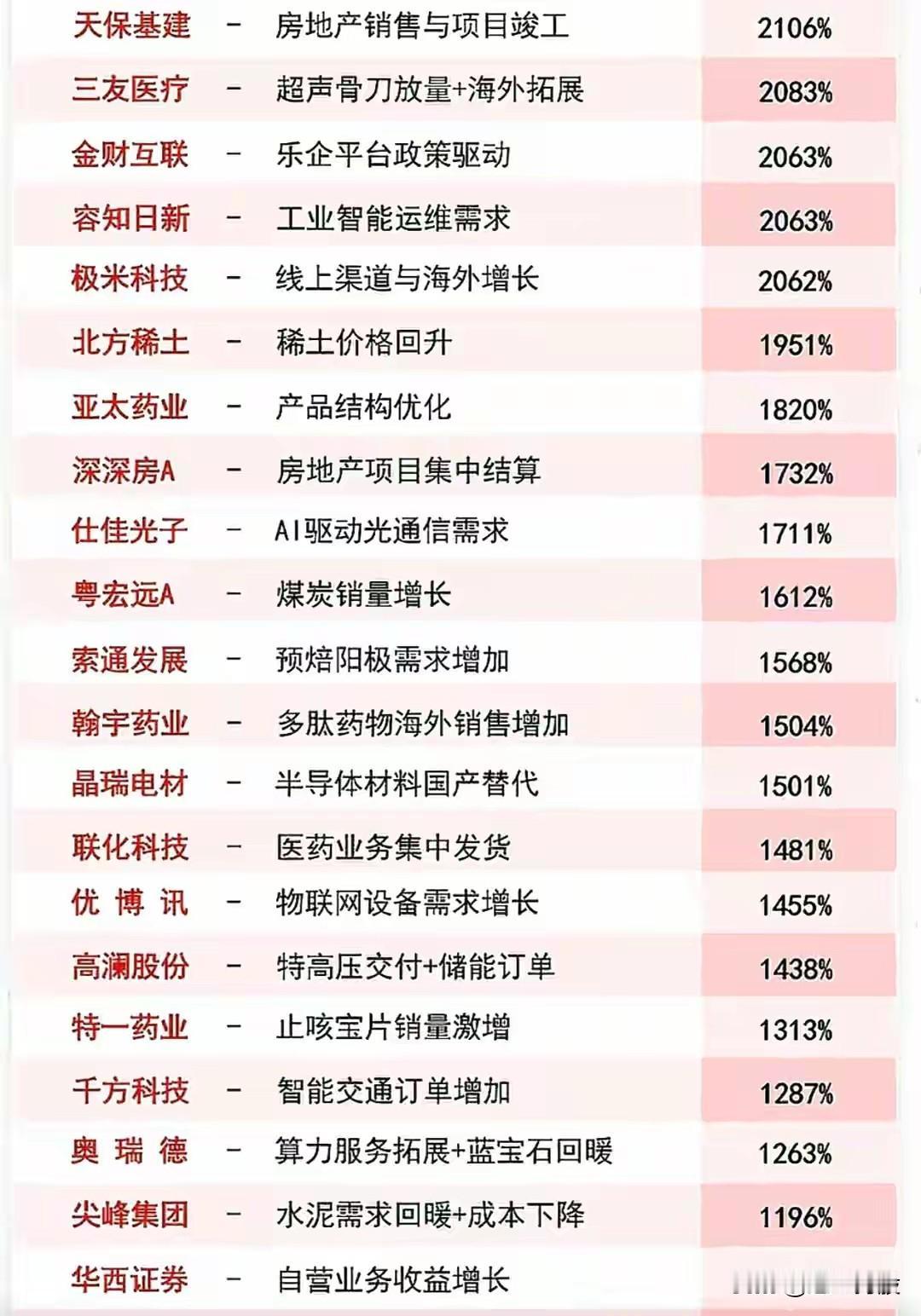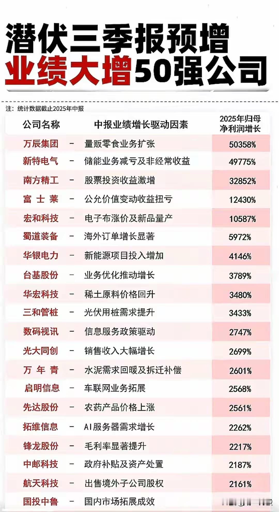 2025年三季报预增业绩50强公司 该榜单聚焦2025年三季报业绩有望大幅增长的企业,基于中报业绩表现及驱动因素筛选,归母净利润增长幅度最高达50358%,重点企业及增长原因如下: - 万辰集团:增长50358%,得益于量贩零食业务快速扩张; - 新特电气:增长49775%,主因储能业务减亏及非经常性收益; - 南方精工:增长32852%,受股票投资收益大幅增加推动; - 富士莱:增长12430%,源于公允价值变动收益扭亏为盈; - 宏和科技:增长10587%,因电子布涨价及新品量产; - 其他代表企业: - 蜀道装备(5972%,海外订单增长显著) - 华银电力(4146%,新能源项目投入增加) - 台基股份(3789%,业务优化推动) - 华宏科技(3480%,稀土原料价格回升) - 三和管桩(3433%,光伏用桩需求提升) - 数码视讯(2747%,信息服务政策驱动) - 光大同创(2699%,销售收入大幅增长) - 万年青(2601%,水泥需求回暖+拆迁补偿) - 启明信息(2568%,车联网业务拓展) - 先达股份(2561%,农药产品价格上涨) - 拓维信息(2262%,AI服务器需求增长) - 锋龙股份(2217%,毛利率显著提升) - 中邮科技(2187%,政府补贴及资产处置) - 航天科技(2161%,出售境外子公司股权) - 国投中鲁(2149%,国内市场拓展成效) 整体呈现高增长企业集中在消费(如零食)、新能源(储能/光伏)、电子(电子布/半导体)、医药(农药/多肽药物)及周期性行业(水泥/稀土)等领域,驱动因素包括业务扩张、价格回升、政策利好、投资收益及非经常性收益等。 二、其他高增长企业数据补充(第二、三张图) 除上述50强榜单外,另外两组数据(按归母净利润增长幅度从高到低排列)展示了更多业绩爆发企业,核心信息包括: - 天保基建:增长2106%,受益于房地产销售与项目竣工; - 三友医疗:增长2083%,因超声骨刀放量及海外市场拓展; - 金财互联:增长2063%,受乐企平台政策驱动; - 容知日新:增长2063%,源于工业智能运维需求增长; - 极米科技:增长2062%,凭借线上渠道与海外市场增长; - 北方稀土:增长1951%,因稀土价格回升; - 其他:深深房A(1732%,房地产项目集中结算)、仕佳光子(1711%,AI驱动光通信需求)、粤宏远A(1612%,煤炭销量增长) - 翰宇药业:增长1504%,得益于多肽药物海外销售增加; - 晶瑞电材:增长1501%,因半导体材料国产替代进程加速; - 联化科技:增长1481%,源于医药业务集中发货; - 优博讯:增长1455%,受物联网设备需求增长推动; - 高澜股份:增长1438%,凭借特高压交付及储能订单增加; - 特一药业:增长1313%,因止咳宝片销量激增; - 千方科技:增长1287%,受智能交通订单增加带动; - 奥瑞德:增长1263%,源于算力服务拓展及蓝宝石业务回暖; - 尖峰集团:增长1196%,因水泥需求回暖及成本下降; - 华西证券:增长1195%,凭借自营业务收益增长; - 其他:盛天网络(1186%,游戏出海收入激增)、国联民生(1185%,合并后业务协同爆发)、牧原股份(1169%,生猪价格回升+降本增效)等。 这些企业覆盖房地产、医疗设备、智能硬件、稀土材料、医药制造、半导体、证券、游戏等多个行业,增长逻辑与市场需求爆发、技术替代、政策支持、海外拓展及成本优化等密切相关。 总结 2025年三季报业绩预增的核心企业具有以下特征: 1. 行业分布广泛:涵盖消费(零食)、新能源(储能/光伏)、电子(半导体/电子布)、医药(农药/多肽/医疗器械)、周期(水泥/稀土)、房地产、金融(证券)等; 2. 增长驱动多元:主要包括业务规模扩张(如量贩零食、光伏用桩)、价格回升(稀土/生猪/水泥)、政策利好(乐企平台/信息服务)、投资收益(股票/政府补贴)、非经常性收益(资产处置/股权出售)及技术驱动(AI算力/光通信/半导体国产替代); 3. 高增长普遍显著:多数企业归母净利润增幅超1000%,部分龙头企业甚至达到数万百分点(如万辰集团50358%、新特电气49775%),反映2025年中报阶段部分上市公司业绩迎来爆发式增长。