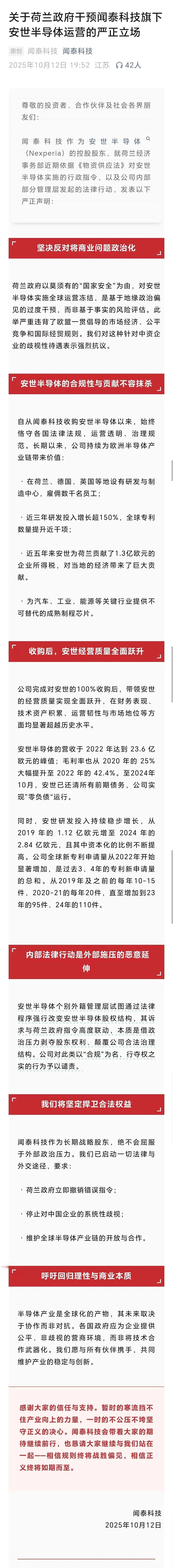 荷兰政府之所以突然对闻泰科技麾下子公司安世半导体实施全球运营冻结,并不是为了其所谓的“国家安全”,而是有另外三个原因。 第一,来自于美国的压力。美国之前一直对荷兰施加压力,要求荷兰限制阿斯麦对华出口光刻机,甚至对中国之前就已经采购了的芯片制造设备的维护服务,也要求阿斯麦不再提供,现在荷兰政府对安世半导体实施全球运营冻结,其背后的重要原因之一也是美国的施压。 第二,来自于安世半导体外籍管理团队的夺权野心。闻泰科技从2018年开始,经历5年时间,花费330亿元,完成了对安世半导体的100%收购,收购之后很快让安世半导体进入运营正轨,连年盈利,到2024年10月,更是使得安世半导体还清了所有前期债务,实现“零负债”运行。 这样一个公司,毫无疑问前途广大,潜力无穷,自然就引起了一些人的垂涎,滋生了其外籍管理团队的夺权野心,现在趁着荷兰政府对安世半导体实施全球运营冻结的机会,这个外籍管理团队便趁虚而入,夺走了张学政的权力,还试图改变安世半导体的股权结构,把这个公司纳入自己囊中。 第三,欧美在28nm以上成熟制程芯片领域的竞争力变弱,心中产生极大恐惧,因此选择用野蛮手段维持自身在这方面的优势,而这则是最根本性的一个原因。 按照其技术水准,芯片分为高端芯片和成熟制程芯片,一般来说成熟制程芯片都是28nm以上的规格,安世半导体生产的就是成熟制程的车规芯片。 我们在高端芯片领域还比较落后,但是在成熟制程芯片领域,这些年却是突飞猛进,取得了巨大的成绩。 根据美国胡佛研究所的统计,我国成熟制程芯片的产能,已经占全世界的40%,而且这个比重还在提升;2024年我国芯片出口额更是达到了1595.5亿美元,就连台湾、日本等芯片大国,都开始进口我们的成熟制程芯片。 按照这个速度继续发展下去,我们在成熟制程芯片领域的优势将不可撼动,成为绝对霸主。 欧美自然恐惧这样的事情发生,但是他们的制造业越来越衰落,已经根本无法通过正常手段与我们竞争,因此最终荷兰政府就采取了海盗式的野蛮办法,不顾规则,直接抢劫。 这也算是欧美的本性,对自己有利的时候,他们就会很讲规则,但是对自己不利的时候,他们就会采取野蛮手段强抢。 只不过,这样的做法不会有任何用处,最终荷兰政府只会自取其辱。 之所以如此,是因为现在的我们,已经有了足够的反制手段,单单是一个稀土管制就能够让阿斯麦等芯片设备制造商陷入绝境,而且安世半导体的主要市场是在中国,因为我国新能源电动车飞速发展,提升了对车规级半导体芯片的需求,就算荷兰政府真的夺走了安世半导体,没有了中国市场,最后结局也会是一地鸡毛。