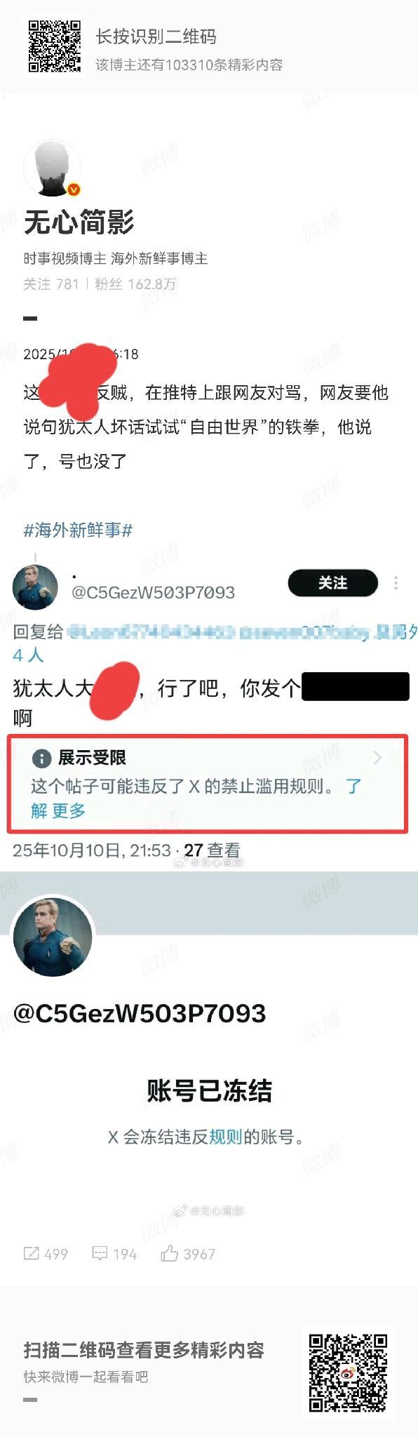 太好笑了,最近推特上有一个反贼老哥跟网友对骂,网友就说你敢在这里骂犹太人吗?骂了你就知道“自由世界”的铁拳是什么滋味了。那个反贼老哥不服气,竟然还真的按照要求骂了,结果只是说了一句,他的账号立刻被封,彻底冻结。这个真的是鲜明体现出欧美的“言论自由”了,他们天天嚷嚷着什么言论自由,实际上把言论控制得比谁都要严密。不知道那个反贼老哥现在是什么想法,估计已经道心崩溃了吧,原本信仰着西方世界的言论自由氛围,结果现实却狠狠给他上了一课。