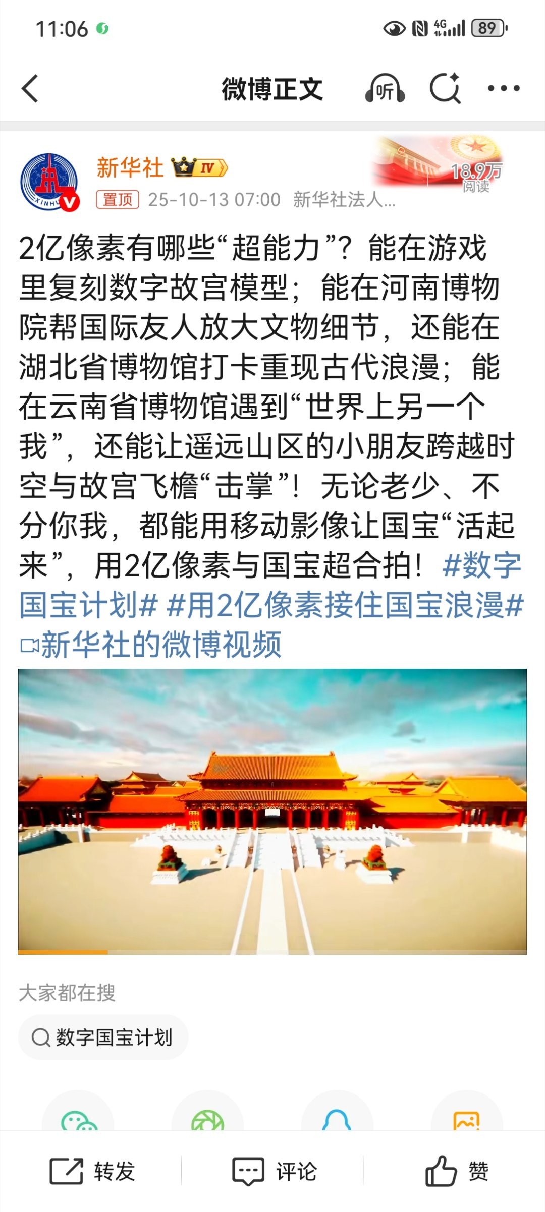 用2亿像素接住国宝浪漫科技赋能文化传承!2亿像素让文物细节纤毫毕现,既助力文化保护,更打破时空限制,让千里之外的观众也能"触摸"国宝。数字技术正以生动有趣的方式激活传统文化,值得大力推广。