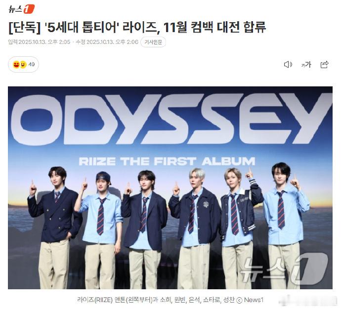 RIIZE将于11月底发行新单曲 13日据独家报道,RIIZE将于11月底发行新单曲。此次是组合自5月发行首张正规专辑《ODYSSEY》后时隔6个月再次回归。