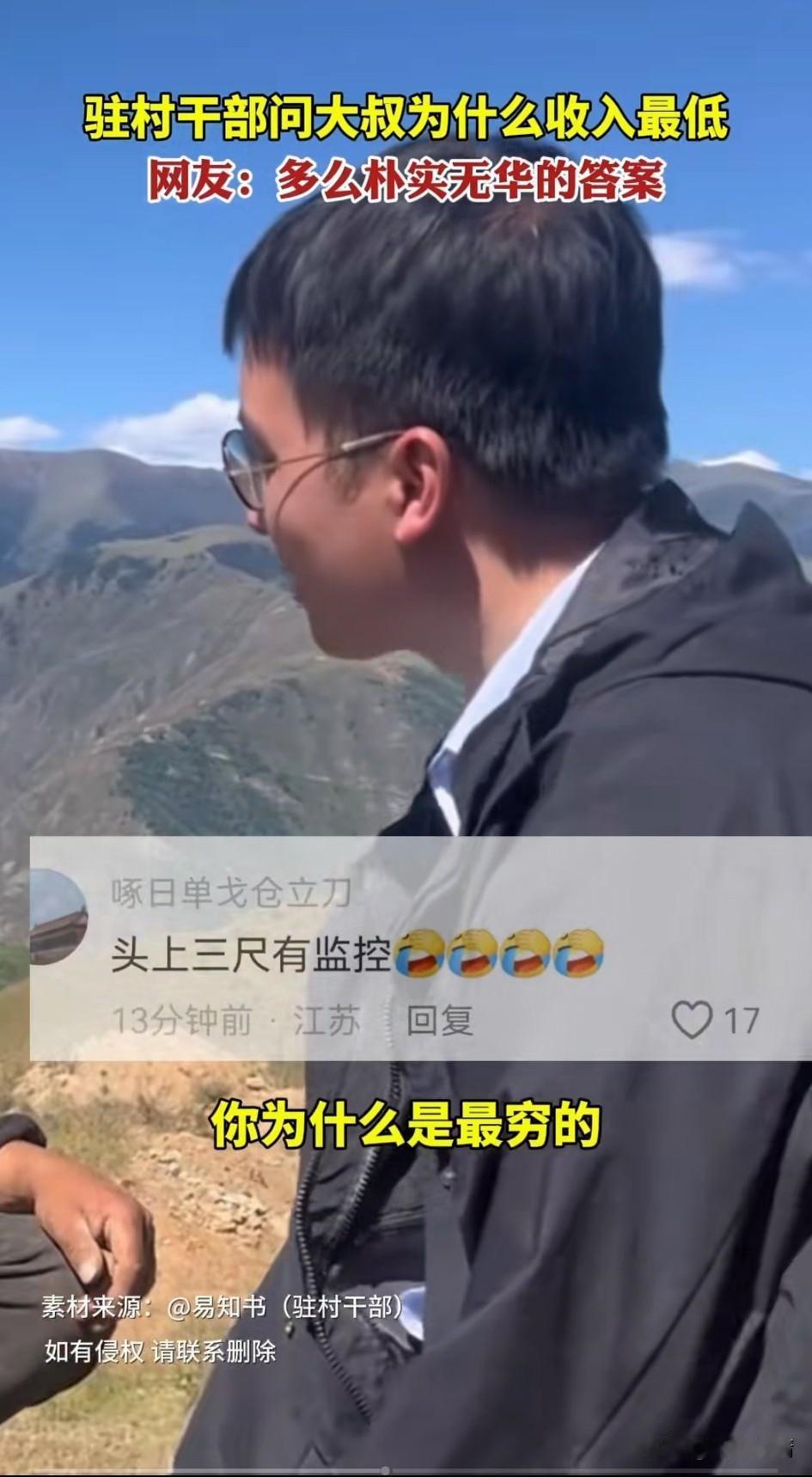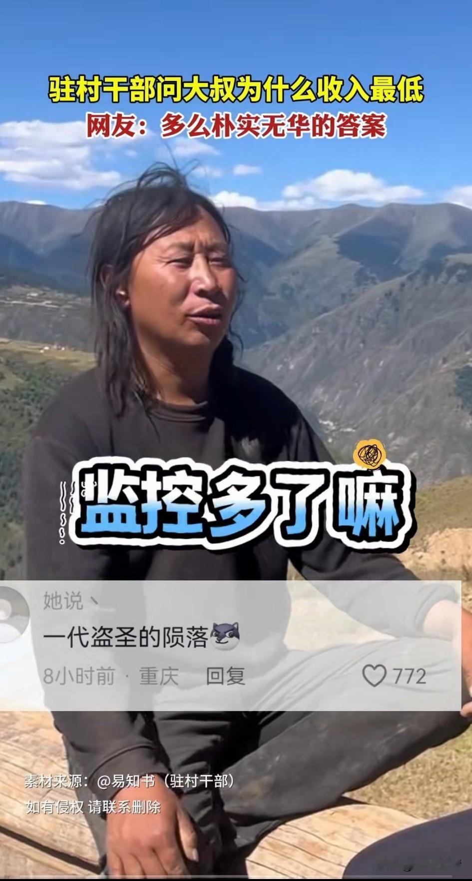 一大学驻村干部询问一个盘腿的村民, 叔,咱认识这么久了, 在这个村子里面为什么你最穷, 大叔也是仙风道骨, 长发飘飘颇有世外高人之风, 我和大学生驻村干部一样很想知道, 结果大叔的回答出人意料, 监控多了嘛, 多么朴实无华的回答, 科技发展的今天, 确实到处都是摄像头, 另外现在出门都是手机, 拿钱包带纸币的人也少了很多了, 一代盗圣就这么回归乡村也算是最好的安排了,看得出来这大叔以前可是老江湖了,如今被监控搞得都失业了, 祖传手艺后继无人了? 大家对于村里面最穷大叔的回答满意吗? 幽默搞笑段子 现在小偷比以前少了,是因为祖国富强了么 农村的小偷怎么越来越少了 盗圣 驻村人才