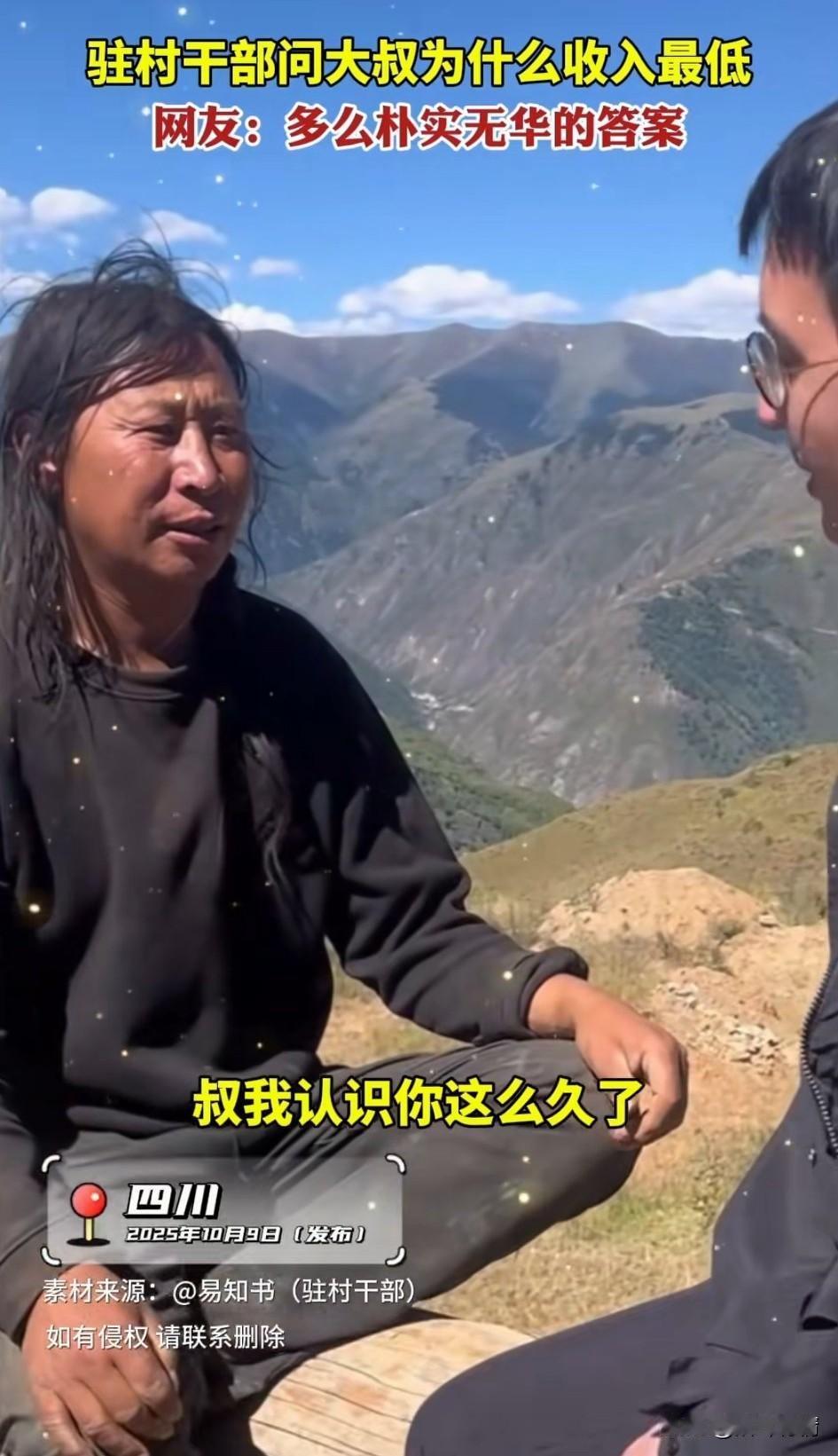 一大学驻村干部询问一个盘腿的村民, 叔,咱认识这么久了, 在这个村子里面为什么你