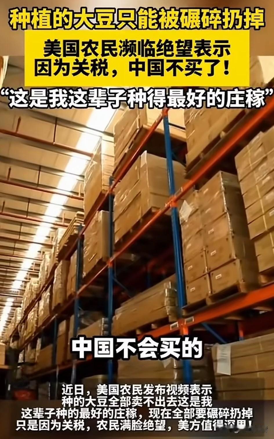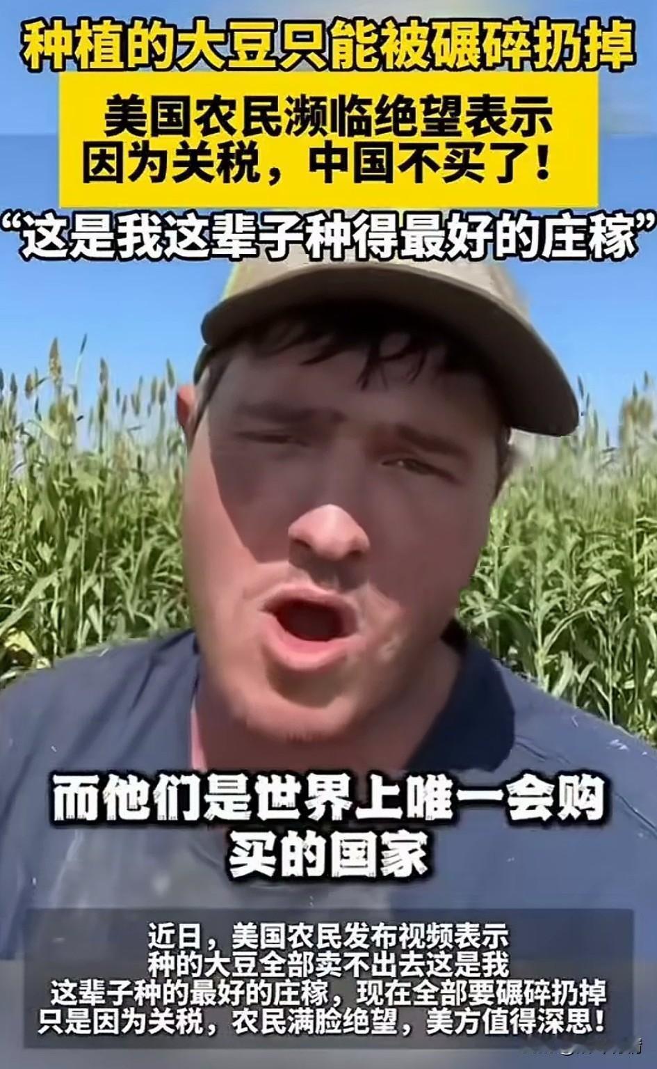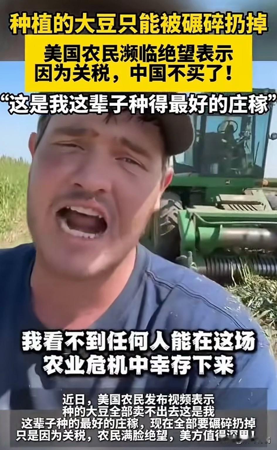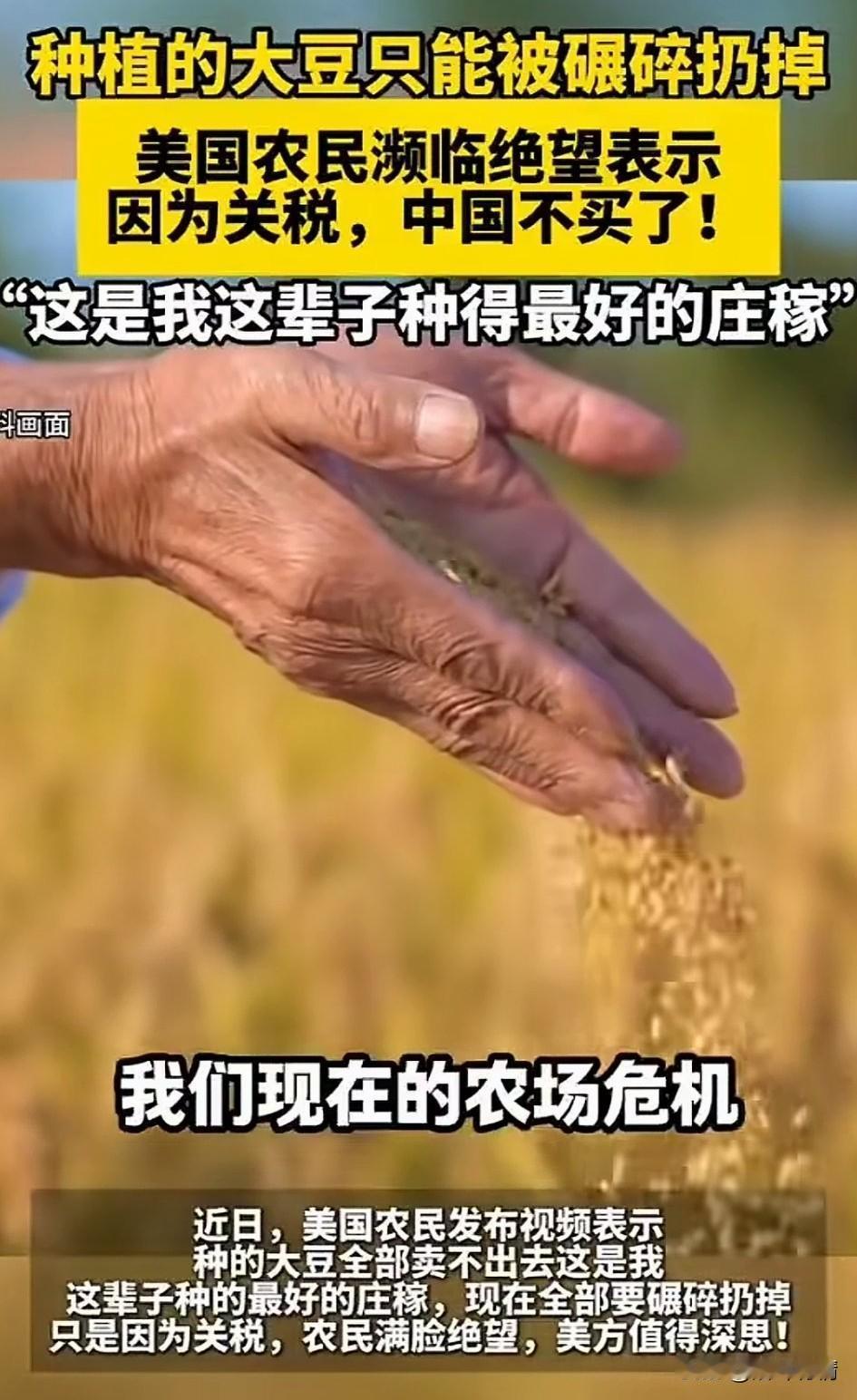 近日中美关税战再起, 第一批受害者出现了, 美国农民濒临绝望, 因为他们中的大豆唯一的买主是中国, 因为关税被增加了好多, 中国商人已经不买那里的大豆了, 那里的农民也知道这个其实, 因此为社交平台大声疾呼, 我看不到任何人能从这场农业危机下存活下来,这是我这辈子中的最好的大豆,如今因为关税我们的大豆卖不出去了,只能被碾碎扔掉, 这真是太可惜了, 据悉美国种的这种大豆和我们种的是不一样的,他们这种大豆只能榨油, 其中国内的转基因油的原料便来自这里,以后中国市场转基因大豆油可能要涨价了,而这些油又流向了餐饮业!这势必会对我国市场有一定影响。 不过我们以后也能少吃一些转基因大豆油,换种思路对我国民众也算是一件好事! 大家对于美国大豆因为关税而只能碾碎扔掉怎么看? 社会新闻 中美关税战升级,你怎么看? 转基因大豆油能不能吃 国产大豆是放弃还是坚守? 中美大豆