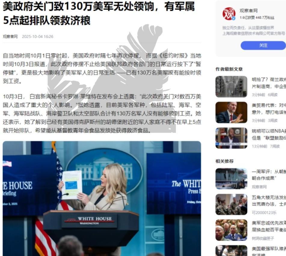 白宫新闻发言秘书莱维特传来一则令人揪心的消息:由于美国政府停摆,130万美军工资发不出,不少美军士兵及其家属竟要靠基督教救济过日子。这背后究竟藏着怎样的乱局? 各位义父,点个关注,欢迎评论,爱你们哦。 时间回到9月30号,本该通过的临时拨款法案卡了壳。国会山两党在国防开支上吵得不可开交。共和党紧紧攥着国防部9800亿美元的军费清单,非要硬塞200亿美元边境墙拨款,还放话要砍掉对乌克兰的部分军事援助。 他们心里打着小算盘,边境墙是保守派一直力推的项目,通过增加拨款能讨好这部分选民,为选举增加筹码。而民主党则咬死边境拨款不合理,反过来要求追加150亿军人福利开支。他们深知军人群体在美国社会中的重要地位,争取军人福利能赢得这部分人的支持。 两边在国会吵了三周,连个过渡性的拨款方案都没谈成,直接让联邦政府按下了停摆键。在政客眼里,争赢政治立场似乎比130万美军的生计重要多了。 这130万现役美军中,80多万基层士兵本就靠月薪扛着家庭开支。北卡罗来纳州布拉格堡基地的一名陆军中士,就是这场乱局的典型受害者。 全家四口房租还差三天到期,工资卡却空空如也。无奈之下,他只能带着妻子去附近的圣约翰教堂领救济包。当他们站在教堂前,看着长长的队伍,心里满是无奈和心酸。 妻子眼里噙着泪,轻声说:我们怎么沦落到这个地步了。中士握紧妻子的手,强忍着内心的痛苦说:别怕,会好起来的。救济包里的罐头和麦片能撑一周,可孩子的奶粉还得四处借。 这不仅仅是这一个家庭的困境,得州胡德堡基地外的几所教堂,最近每天清晨七点就排起长队,家属们抱着纸箱等尿布、面包。教堂牧师无奈地说,周末单日援助的家庭数,比上个月翻了三倍。曾经喊着保卫自由的美军家属,如今要靠宗教救济过日子,这画面说出去都嫌丢人。 从国际视角看,美国一直以强大的军事力量自居,在国际事务中横行霸道。可如今,美军士兵连基本的生活保障都成问题,这无疑是对美国军事形象的一次沉重打击。 其他国家会怎么想?美国连自己士兵的温饱都解决不了,还谈什么在国际上维护所谓的安全和秩序。这可能会让一些国家对美国的军事承诺产生怀疑,进而影响美国在国际军事合作中的地位。 社交媒体上,这一事件也引发了轩然大波。网友们纷纷晒出士兵排队领救济和两党议员在国会互骂的对比图,配文美国的优先级真是魔幻。 给士兵发工资话题阅读量破20亿,可见民众对这一事件的关注度之高。大家都在质问,为什么政客们只顾着自己的政治利益,却忽视了这些为国家付出的士兵。 再看看企业在这场乱局中的表现。华盛顿圣马修大教堂一周内接了23家企业捐赠,每天发200多个救济包,有吃的,还有儿童书籍和卫生用品。 这些企业看似是在做慈善,但背后也有着自己的考量。一方面,这是企业履行社会责任的一种方式,能提升企业的社会形象;另一方面,在当前社会舆论高度关注的情况下,企业也想借此机会展示自己的正能量,赢得消费者的好感。 随着停摆进入第三周,救济资源也快扛不住了。芝加哥有家教堂宣布救济包减半,因为捐赠跟不上需求;西雅图的军人之家搞众筹,三天才筹80万,离500万目标差得远。这反映出美国社会在面对这样的危机时,缺乏有效的应对机制。 在我看来,这根本不是军费够不够的问题,而是两党都想拿预算换选票。共和党想靠边境墙拨款讨好保守派,民主党要靠军人福利巩固支持率,130万美军的生计,不过是博弈里的牺牲品。 这场乱局如果持续下去,不仅会影响美军的战斗力,还会进一步加剧美国国内的社会矛盾。希望美国政客们能早日放下党派之争,真正为这些为国家付出的士兵们解决实际问题。 文章描述过程、图片都来源于网络,涉及版权或者人物侵权问题, 或有事件存疑部分,联系后即刻删除或作出更改