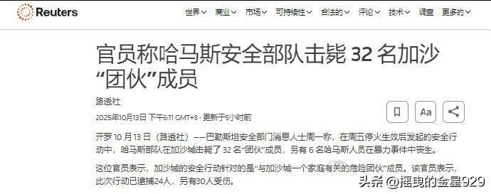 路透社援引“巴勒斯坦安全部门消息人士”的话说,“哈马斯”于停火后在加沙市打击了“一个与当地某家族有关的帮派”,打死了32人、打伤30人、逮捕24人,己方6人在冲突中被杀,并表示这些行动得到了特朗普的默许。 虽然该报道没有指名道姓,且“巴勒斯坦安全部门消息人士”这种信源描述也让人一头雾水,不过这个报道显然说的是昨天“哈马斯”在加沙市与多格穆什家族的冲突,他们写的伤亡人数和昨天加沙信源报告的人数大差不差,可以互相佐证。