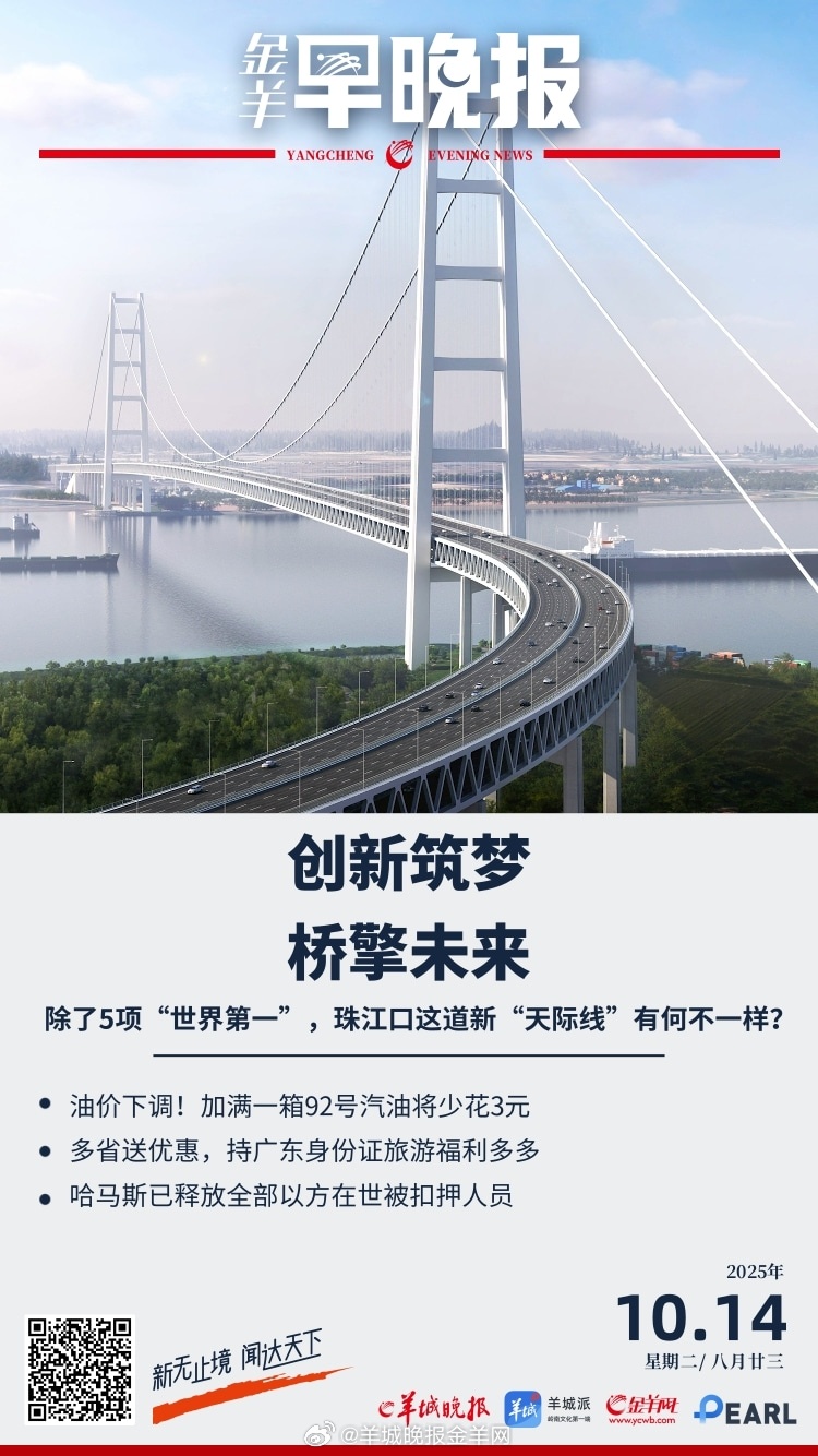 #金羊早晚报# 除了5项“世界第一”,珠江口的这道新“天际线”究竟有何不一样?外贸大省挑大梁!前三季度广东等5省市对全国进出口增长贡献超八成;美国将对华商品加征100%关税,外交部:这不是同中方打交道的正确方式;油价下调!加满一箱92号汽油将少花3元;我国首次批量发行无障碍中国和世界地图;博主自发修复戈壁滩“为人民服务”大字,人民空军留言致谢;网传“港车北上”“粤车南下”不实信息,香港运输署:切勿误信!成都通报天府大道交通事故:驾驶人邓某某死亡,涉嫌酒后驾车;明年起,广东省内夫妻可以互查名下房产、车辆等财产状况;多省送优惠,持广东身份证旅游福利多多;百年惠如楼亮相精品美食周,经典粤味唤醒广州城市记忆;现货黄金,再创新高!今年是1979年以来金价涨幅最大的一年;“WPS格式”冲上热搜后,金山软件迎来大涨;姚明可以领NBA的养老金了!每年约可领取16万元人民币;诺贝尔经济学奖揭晓:3名经济学家获奖;以色列媒体:加沙战争结束;哈马斯已释放全部以方在世被扣押人员。#业主私挖300平地下室32户开裂##山姆回应配送员电动车挂满大件货物##记者卧底论文代写代发工厂# 更多精彩报道,请扫码关注羊晚全媒体报道!