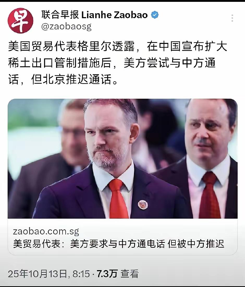 新加坡联合早报10月13日发表韩咏红(联合早报副总编)的评论称:“有分析人士比喻,美国对中国的打压像洒胡椒面式,从2018年对中兴科技采取科技制裁,到打压华为,到不断增加实体清单,是大范围内一点一点打压。而中国这次猛烈回击,是一次将力度拉到前所未有的高值,从军用到民用稀土都全面管制,力度超出意料。”韩咏红说了什么不重要,因为她就是一个县城小报的副总编,但重要的是她提到的制裁。 就制裁而言,任何制裁对对手造成伤害的同时也会对自己造成伤害,只是程度不同,美国对中国撒花椒面或者是撒网式的制裁就是这样,也在对美国造成伤害。但它们乐此不疲的原因是因为它们认为它们能承受这些伤害。 中国当然也能承受损失,但问题是是作为被制裁的一方承受的,这就很屈辱。中国决意做出改变——又不是没有手段。既然要出手就要稳准狠地打痛美国,于是,按这个韩咏红评论的“力度拉到前所未有的高值,从军用到民用稀土都全面管制,力度超出意料”的新的稀土物项出口管制决定公布啦。 这个决定当然会对我们自身造成一定伤害,但由于我们是出手方,对敌方造成的伤害更大,这不是伤敌一千自损八百,也不是伤其十指不如断其一指,而是断其一臂,让其痛彻心扉。从事后以及现在特朗普和其一众高官们的大呼小叫的反应看,效果符合预期。这清楚地告诉美国,“打,我们奉陪到底”这个警告和承诺不是空话,说到做到。还清楚地告诉美国,如果美国认为中国让其断其一臂、血肉模糊的出手,按特朗说的有些“阴险”的话,那也是美国自找的。如果像美国商务代表格里尔透露的,想与中国通话(商讨此事)的话,那就先反躬自省,学会与中国打交道的正确方式,顺便把伤疗好了再说。