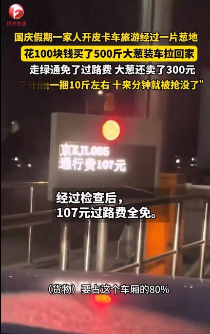 “赚大发了!”10 月 9 日北京一男子开皮卡车带家人到承德游玩。 这男子叫柴建军,在朝阳区开了家五金店,国庆假期最后一天想带老婆孩子去承德避暑山庄逛逛,还想顺便去隆化县的表哥家串个门,他开的是辆黑色长城炮皮卡车,后备箱平时拉五金配件,这次特意清空了,想装些承德的特产回去。 路过隆化县章吉营乡的时候,路边有片绿油油的葱地,一个戴草帽的大爷正蹲在地里拔葱,柴建军老婆说 “家里葱快没了,要不问问多少钱,买点回去”,他就把车停在路边,摇下车窗喊 “大爷,您这葱怎么卖啊?”,大爷直起腰擦了擦汗说 “2 毛 1 斤,要得多还能便宜点”,柴建军愣了下,北京菜市场的葱都卖到 2 块 5 一斤了,这也太便宜了! 他下车走到葱地边,捏了捏葱叶,又看了看葱白,说 “这葱挺新鲜啊,您这儿有多少能卖的?” 大爷说 “还有一千多斤,你要是都要,2 毛一斤就行”,柴建军跟老婆商量 “咱买 500 斤吧,回去自己吃,再给邻居朋友分分,说不定还能卖点”,老婆一开始嫌占地方,说 “500 斤得装多少啊,孩子坐后面都挤了”,可架不住柴建军劝,最后还是同意了。 大爷叫上老伴一起帮忙装葱,用草绳一捆捆扎好,一捆 5 斤,刚好扎了 100 捆,装了满满一皮卡后斗,柴建军扫码付了 100 块钱,大爷还多送了他两捆,说 “路上吃”。 下午往回走的时候,到了承德西高速收费站,收费员李姐看他车后斗装满了葱,就问 “师傅,您这拉的是鲜活农产品不?” 柴建军赶紧说 “是刚买的大葱,新鲜着呢”,李姐拿着检测仪看了看,又对照了下手里的《鲜活农产品运输绿色通道政策目录》,说 “符合条件,能免过路费”,最后显示原本要交的 107 元过路费直接免了,柴建军老婆笑着说 “这葱还没吃呢,先省了一笔钱”。 回到北京后,柴建军把葱卸在小区楼下,在业主群里发了条消息 “刚从承德拉回来的新鲜大葱,5 元一捆(5 斤),要的来楼下拿”,没半小时就围了不少邻居,有的说 “比超市便宜多了”,有的说 “这葱看着就好”,100 捆葱一下就卖了 80 捆,收了 400 块钱,剩下的 20 捆留着自己吃和送朋友。 他把这事拍了段视频发在抖音上,配文 “100 块买葱,省 107 过路费,卖了 400 块,这趟旅行值了”,没两天就有十几万点赞,网友评论 “大哥太会过日子了,这生意头脑绝了”,还有人说 “我上次去农村买白菜,也省了过路费,政策是真给力”。 后来我查了交通运输部 2025 年发布的《鲜活农产品运输绿色通道政策解读》,里面明确说新鲜蔬菜属于免过路费范围,像大葱、白菜这些都在目录里,只要装载量达标就能享受优惠。你们要是出门遇到这种便宜又能享受政策的农产品,会像柴大哥这样多买些吗?