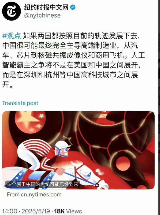 万万没想到,纽约时报竟然会说,如果中美都以目前轨迹继续发展,最终可能会由中国完全主导高端制造业,至于“人工智能霸主”之争,也只会在深圳和杭州等之间展开。 该报道会提及深圳和杭州,也不是没有理由的,在3月份的时候,深圳就一口气甩出几份重磅计划。 目标直接砸出“万亿级”,在明年 AI 终端产业规模要冲1万亿,培育10家现象级企业,光产品就要造1.5亿台。 更狠的是机器人领域,2027年要搞出1千亿产业规模,还得突破 AI 芯片这类“卡脖子”技术。 而杭州也没闲着,靠DeepSeek、宇树机器人等新势力强势崛起,凭数字经济生态逼得深圳加急出招。 两市一个靠华为、大疆的硬科技底盘,一个凭灵活商业模式突围,这场“内斗”连外媒都看呆了。 咱们的底气早藏不住了,根据相关机构的预测,今年中国高端制造市场的规模,可能会破20万亿,占全球35%以上。 新疆天山更甩出实锤,世界首台“首创号”掘进机,在3660米海拔挖穿707米竖井,误差不足硬币厚度,12项核心技术打破垄断。 比亚迪市值超福特、通用、大众总和,工业机器人数量碾压全球,想来这些东西,都被《纽约时报》扒了个底朝天。 几个月之前,深圳又砸100亿产业基金,开放100个AI场景,杭州还在憋大招,照这架势,《纽约时报》说的“中国世纪”,恐怕真要靠高端制造跑出来了!