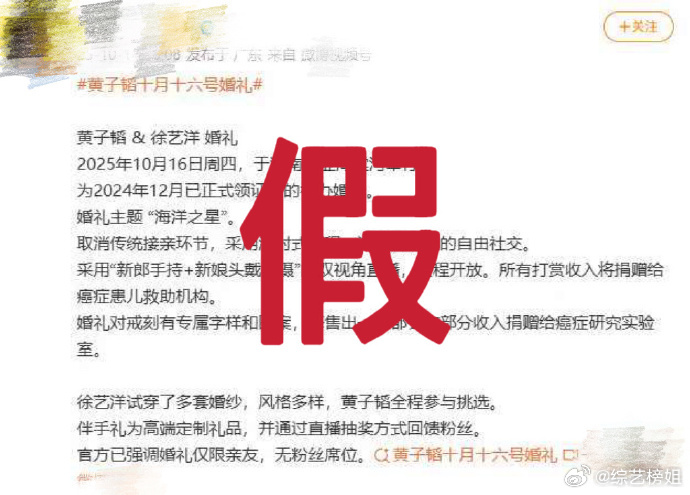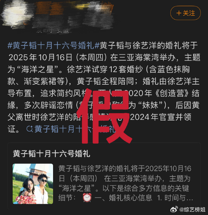 黄子韬工作室发文辟谣“世纪婚礼”一说,并称本次婚礼是纯私人、小范围的,外界无需过度关注。