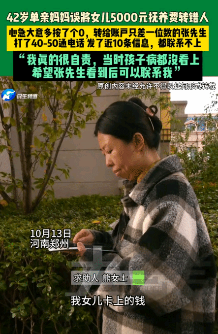 河南郑州,42岁单亲妈妈带女儿看病,转账付费时,竟然多按了个0,误将女儿5000元抚养费转错人,转给账户只差一位数的张先生,她打了40-50通电话,发了近10条信息,对方都不回应!女子哭诉:我真的很自责,孩子病都没看上,希望能还给我,哪怕给你包个红包也可以!” 据大参考10月13日报道,这位妈妈自己带着女儿生活,日子过得本就不容易,最近女儿身体不舒服,她好不容易凑了5000块钱,准备带孩子去看病。 这笔钱,是孩子每个月的抚养费,是生活的指望,也是看病的救命钱,到了付费的时候,这位妈妈心里着急,手上操作的时候一不留神,多按了一个数字“0”,钱就转出去了。 等她反应过来,钱已经到了一个陌生人的账户里,这个收款人姓张,银行卡号和她要转的账户只差那么一位数。 发现转错账后,她当时就懵了,钱交不上,孩子的病也看不了,她只能先把孩子带回了家,一路上,她心里又急又气,更多的是自责。 怎么就在这么要紧的关头犯了这种低级错误呢?回到家,她抱着最后一丝希望,开始联系那个姓张的男子。 她翻出转账记录,找到了对方的电话号码,她一连打了四十多个电话,可对方一次都没有接听,电话打不通,她又开始发信息。 她把自己的情况说得清清楚楚,希望能打动对方,可信息发出去后,就像石沉大海一样,一点回音都没有。时间一分一秒地过去,她的心也一点点地沉了下去。 身边的女儿看着妈妈焦急的样子,懂事地问了一句:“妈妈,这个钱是不是要不回来了?”听到女儿这句话,这位妈妈再也忍不住了,眼泪一下子就涌了出来。 她抱着女儿,心里五味杂陈,不知道该怎么回答,这件事在网上传开后,很多网友都觉得特别气愤。 有网友说:“这叫什么事啊?知道是人家孩子的救命钱,还装作不知道,良心不会痛吗?这钱拿着能花得安心吗?” 还有的网友比较理性,提出了一个疑问:“现在转账不是都要核对姓名和账号吗?名字不一样也能转过去?” 其实,有些转账方式,比如ATM机或者通过手机号转账,系统只会显示收款人名字的一部分供你核对,如果当时心里着急,一不留神就很容易忽略掉这个细节。 这种转错账的事情,在生活中并不少见,这位妈妈在万般无奈之下,只能向媒体求助,希望通过媒体的力量,能让那位张先生看到,把钱还回来。 其实,从法律上讲,张先生拿的这笔钱属于“不当得利”,简单来说,就是他没有合法理由获得这笔钱,法律规定他必须返还。 就算他一直不接电话,不回信息,这位妈妈也可以拿着转账记录、她和对方的沟通记录,去法院起诉。 法院判决下来之后,如果他还耍赖不给,这位妈妈可以申请强制执行,让法院直接从他的账户里把钱划走。 道理是这个道理,但走法律程序需要时间,对于等着钱给孩子看病的妈妈来说,每一天都是煎熬,这件事也给我们所有人提了个醒。 转账的时候,特别是大额转账,一定要多留个心眼,输入账号后,仔仔细细核对收款人的姓名和卡号,一个数字都不能错。 如果不放心,可以先转一块钱试试,确认对方收到了,再把剩下的钱转过去,万一真的转错了,也别慌张,第一时间截图保存转账记录,然后立刻联系对方。 如果对方通情达理,事情很快就能解决,但如果遇到像这位张先生一样不配合的人,也不要放弃,马上报警或者咨询律师,用法律武器保护自己的合法权益。 “君子爱财,取之有道”,这句话我们从小就听,捡到东西要归还,不是自己的钱不能拿,这是最基本的道德底线。 这位张先生拿着一个孩子看病的救命钱不还,不仅是道德上的问题,更是触犯了法律,我们希望这位妈妈能够尽快要回属于她的钱,让孩子能早点得到治疗。 也希望那位张先生能早日醒悟,做个有良知的人,把钱还给这位焦急的母亲。 信源:大参考2025-10-13——42岁单亲妈妈误将女儿5000元抚养费转错人,心急大意多按了10月13日河南郑州,个0,转给账户只差一位数的张先生,打了40-50通电话发了近10条信息,都联系不上",我真的很自责,当时孩子病都没看上,希望张先生看到后可以联系我