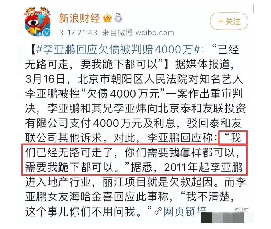 笑死了!李亚鹏宣布离婚,没想到评论区句句都是梗 李亚鹏与海哈金喜于2023年10月正式离婚。 李亚鹏亲自通过视频宣布此事,他表示本来想处理的低调一些,但因朋友问的太多,还是决定公开。 李亚鹏说:“我们已经办理了离婚手续,孩子在她(海哈金喜)身边。” 随后,李亚鹏带着女儿小八出镜,向大家致以节日问候。 视频中,李亚鹏显得心情不错,并未受到离婚影响。 李亚鹏与海哈金喜的婚姻,仅维持了三年时间。 据悉,两人相识于一次公益活动,之后便展开热恋。 海哈金喜是彝族女孩,家境优越,父亲是当地有名的商人。她曾代表东方大国参加世界旅游小姐大赛,并获得冠军。 两人相差19岁,李亚鹏曾在短视频中晒出与海哈金喜的家庭日常。 但随着时间推移,海哈金喜在社交平台晒出的内容,多以她和女儿为主,李亚鹏的身影渐渐消失。 在两人刚结婚时,有媒体拍到李亚鹏与海哈金喜两人同住在李亚鹏名下的豪宅。 后来两人因经济原因搬家到二线城市某小区。 据说这套房子是海哈金喜个人名下的,而她独自承担了这套房子的贷款。 这也曾引发过两人离婚的猜测。 要知道,李亚鹏现在负债累累,身上的债务就有4.5亿,这还不算他自己开公司的债务。此事闹得沸沸扬扬,但李亚鹏在视频中表示,自己所有项目都还好,没有失败的。 而且他近几日刚收回一家公司的控股权,手上又有了现金流,可以说是柳暗花明。 或许正是知道这一点,所以海哈金喜才会选择此时离婚。 两人相识时,正值李亚鹏事业低谷,而海哈金喜则是刚刚走上模特圈,并取得不小的成绩。 两人结婚时,是李亚鹏高调在社交平台晒出恩爱,而海哈金喜则是在隐隐背负着事业与家庭双重压力。 如今,两人分开了结局也算是可见一斑。 对此,您怎么看?欢迎在评论区留言!!