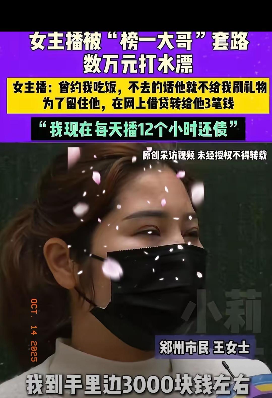 半月主播被“榜一大哥”砸3000就借钱?这哪是赚快钱,是把“陷阱”当“馅饼”咬啊! 谁不想要大方大哥撑场?可素未谋面就砸钱,图的能是主播的才艺吗?大哥先拿几千块礼物当“糖”,钓的就是想走捷径、贪快钱的人。女主播被甜头冲昏头,连大哥借1万、2.5万都敢网贷凑,完全没琢磨:人家凭啥信你,还不是算准你会被“长期饭票”的幻想套住? 现在她每天播12小时还债,看着可怜但真不冤——做主播想赚钱没错,可把陌生人的砸钱当“救命稻草”,本质是赌对方的良心,这风险比直播没人看还大。那些只砸钱不聊别的大哥,心里的算盘比谁都精。 你们要是遇到这种突然砸钱的“大哥”,会先琢磨他的目的,还是也会有点心动?