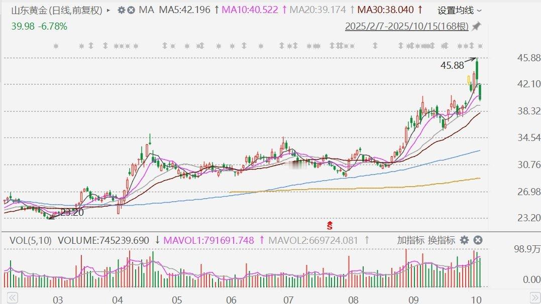【山东黄金发盈喜后AH股逆势齐跌 】10月15日,山东黄金今日逆势下跌,其中,A股一度跌超7%报39.78元,H股一度跌超近8%报36.84港元。山东黄金公告称,预计前三季度纯利为38.0亿元至41.0亿元,同比增加83.9%到98.5%。值得注意的是,山东黄金一季度归母净利10.3亿元,二季度归母净利润17.82 亿元。A股超级赛道迎来大爆发