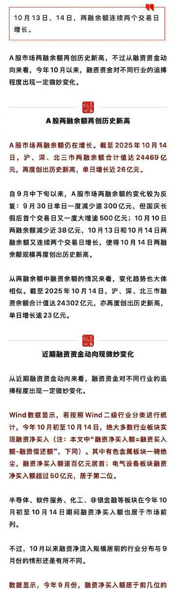 【A股又创造新纪录!】A股两融余额连增两日 A股市场两融余额再创历史新高,不过从融资资金动向来看,今年10月以来,融资资金对不同行业的追捧程度出现一定微妙变化。A股市场两融余额仍在增长。截至2025年10月14日,沪、深、北三市两融余额合计值达24469亿元,再度创出历史新高,单日增长近26亿元。