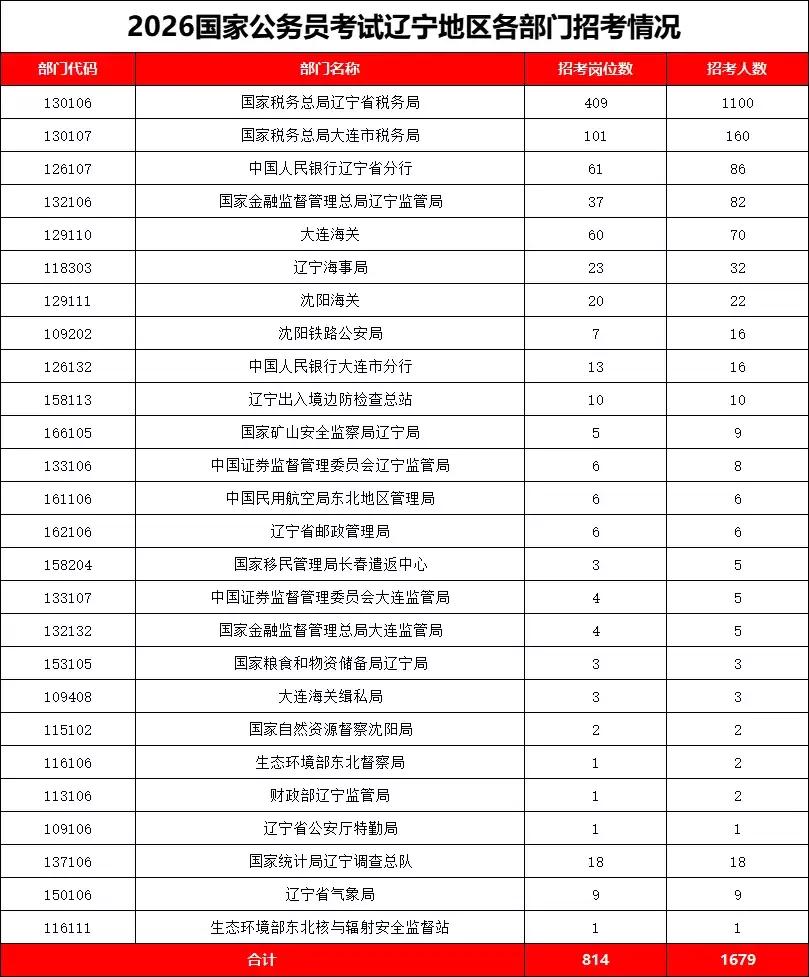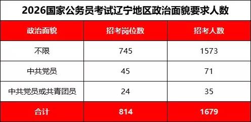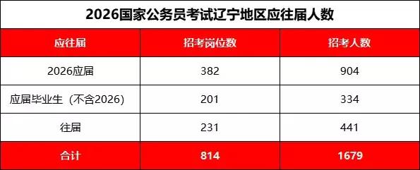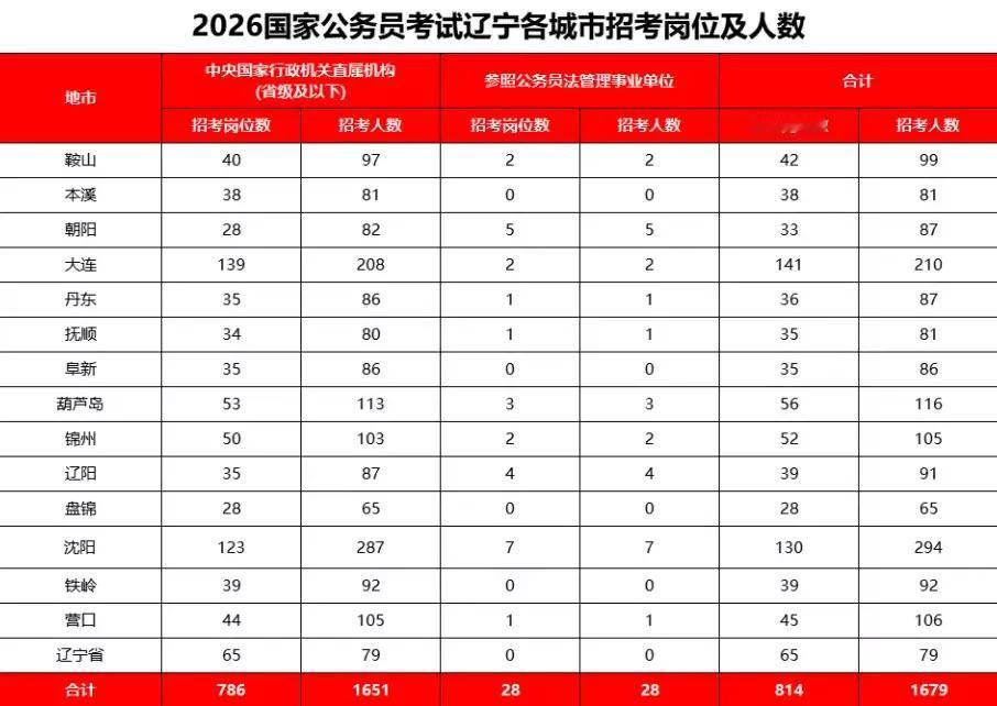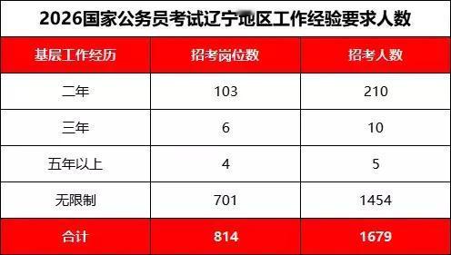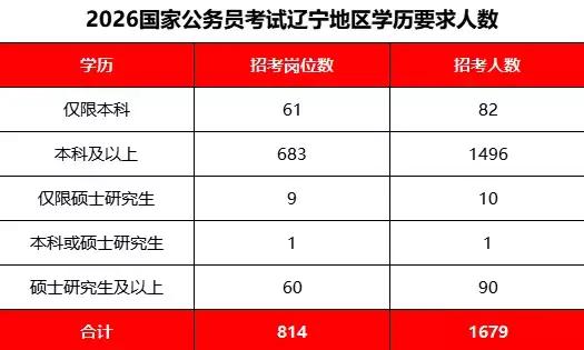 辽宁省2026年国考招详情 辽宁省2026年国考4招涵盖岗位814个,共招录1679人。 涉及岗位包括辽宁省沈阳市铁路公安局,中国人民银行辽宁省分行及各市分行的岗位。与往年相比,辽宁省今年公招人数有所增加。 招录对象为2024年、2025年、2026年的大学毕业生。 今年报考条件有所放宽,普通类考生年龄放宽至38岁,硕士、博士研究生年龄放宽至43岁。具体情况见下方图片。