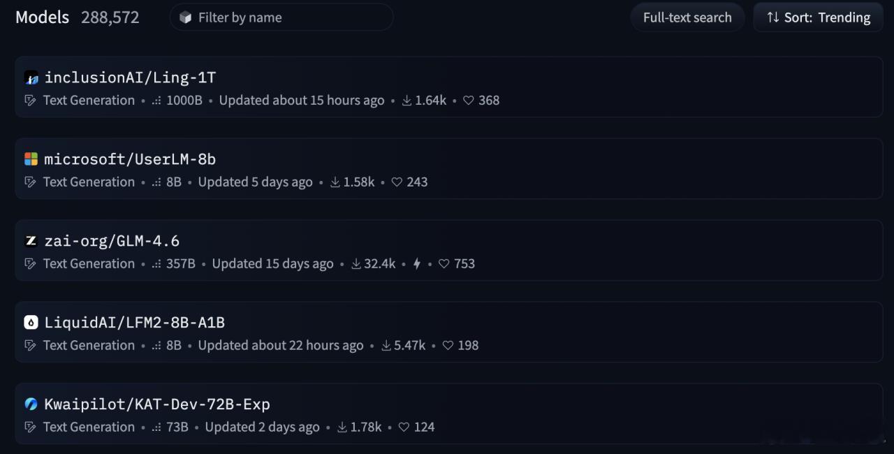在趋势榜中,蚂蚁的Ling-1T、智谱的GLM-4.6,都是当下最受关注的开源模型。【图9】