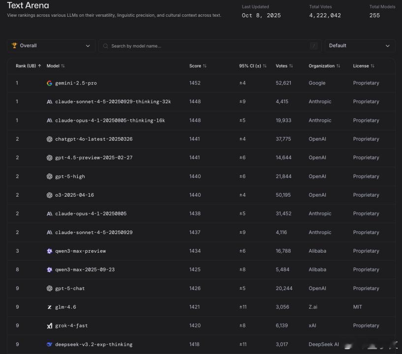 在文本排行榜中,顶级闭源模型如GPT-5、Gemini-2.5-pro、Claude-Sonnet-4.5等之后,紧随而来的就是智谱的GLM-4.6和DeepSeek-v3.2。