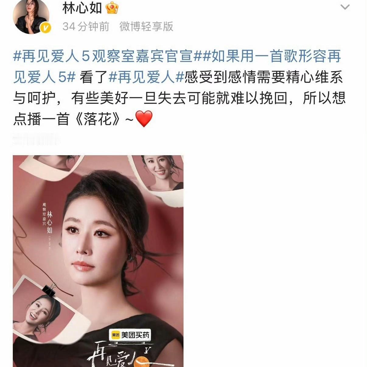 看来网上传闻都是真的 林心如官宣 要参加再见爱人5,更夸张的是,她的身份,还是观察团成员。 这些年以来,李心如是还珠三姐妹里,发展的顺风顺水的一个。 虽然自己不咋出来拍戏,但是老公霍建华,搭档都是周迅这样的大美女。 两个人结婚这么久,依然恩爱如初。在现在的娱乐圈里面,简直就是模范夫妻。 而且林心如,是圈内出了名的善良,当年和周杰演的尔康,简直就是金童玉女。 还是有点担心,这么善良的林心如,真的受得了这个节目吗?毕竟去年麦琳哈哈大笑的阴影还历历在目呢。 大家觉得呢?
