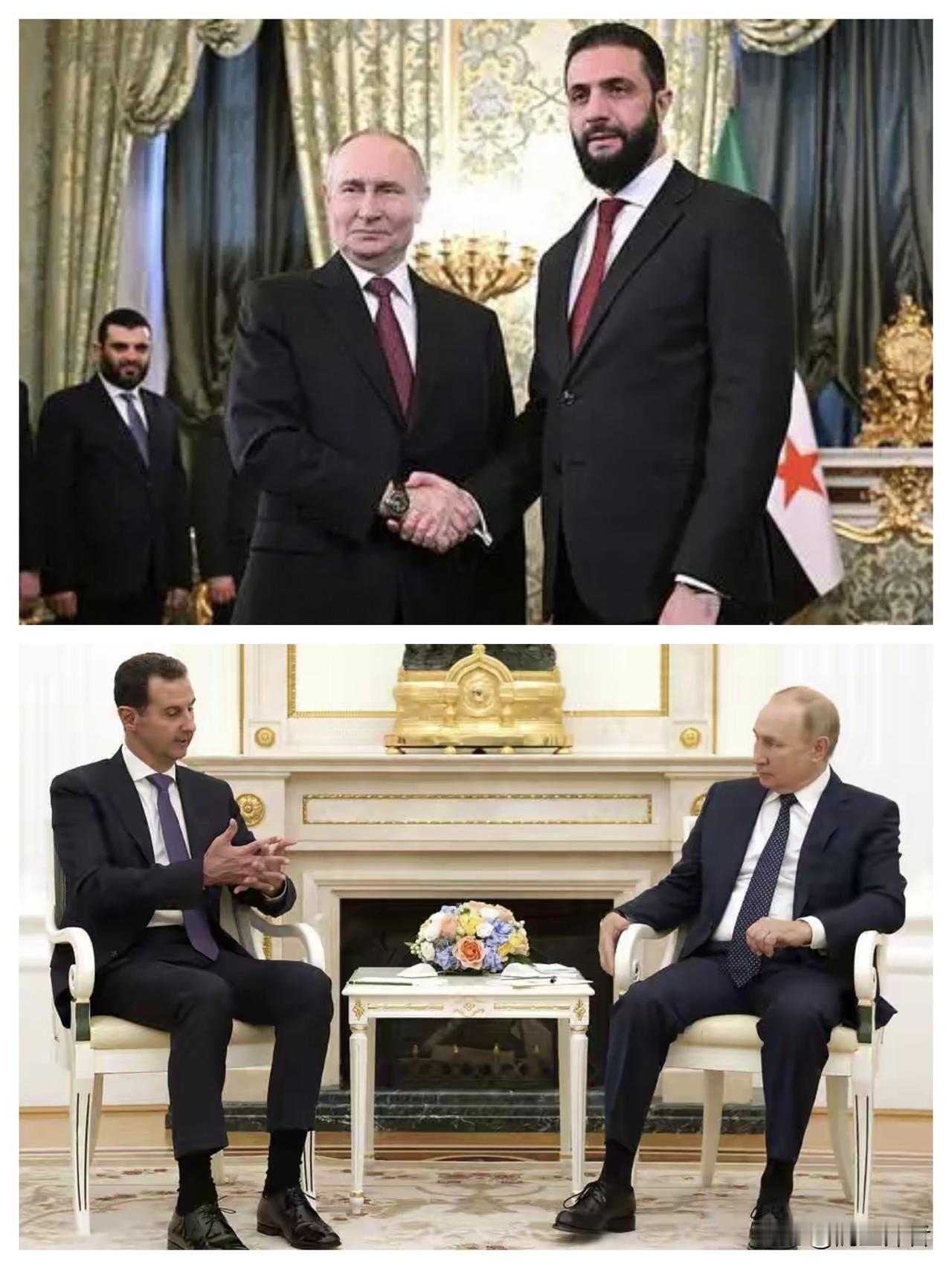 这是普京亲切会见到访的叙利亚前总统巴沙尔和现叙利亚总统沙拉的照片。 两次会见都