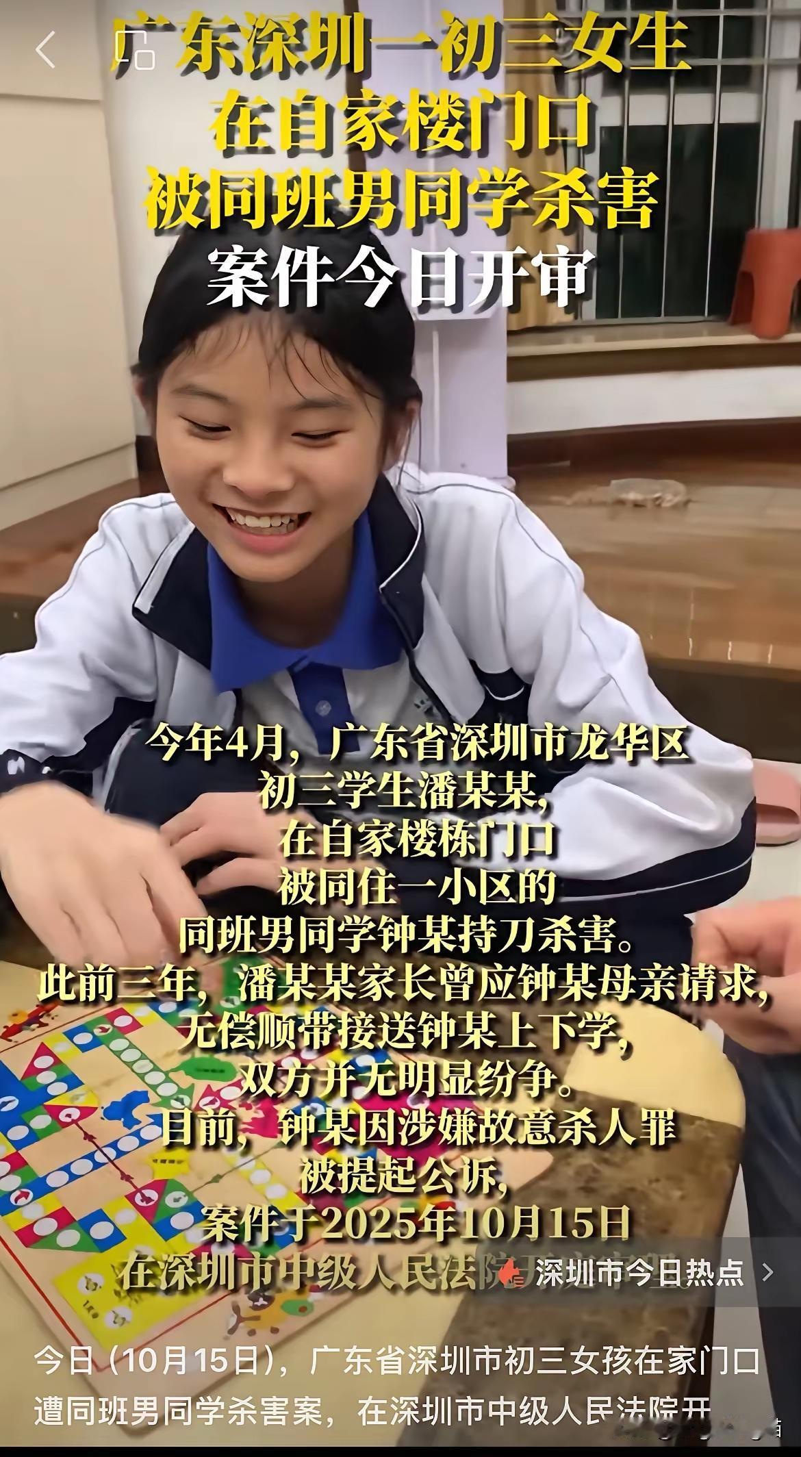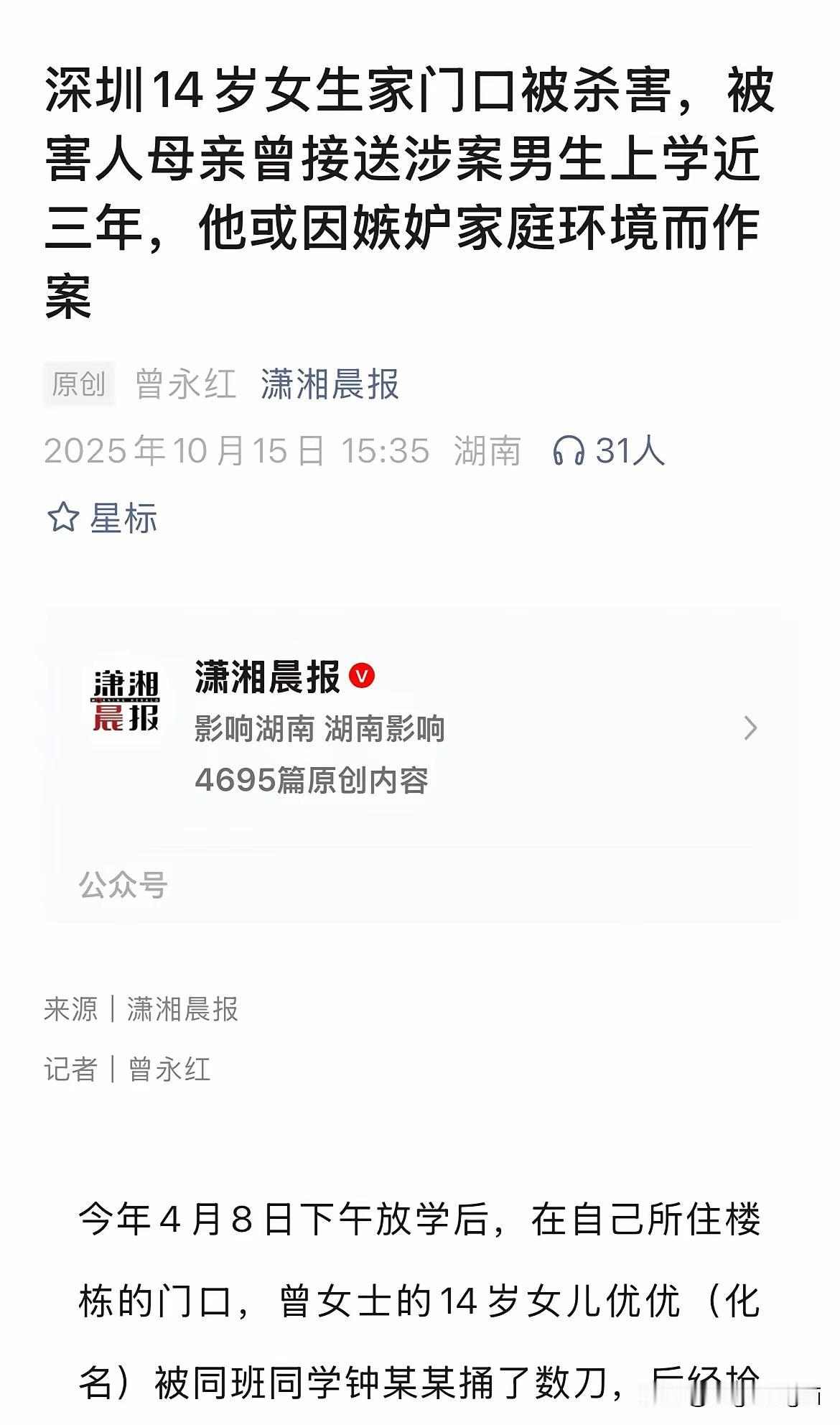 今天一打开手机就看到一则令人思绪万千的新闻,深圳一名初三男生竟将同班女同学刺死我的内心久久不能平复,因为我也做过同样的傻事! 我有过同样的经历,也是帮忙女儿同学(离异妈妈走了)接送,结果那个孩子因为我孩子成绩好,家庭环境比她好,后面在学校处处针对我家女儿,说我家孩子坏话,搞得我家孩子差点心理出问题。后来果断绝交。所以有时候人不能太好心,吸取教训! 农夫与蛇不是随便说说而已!
