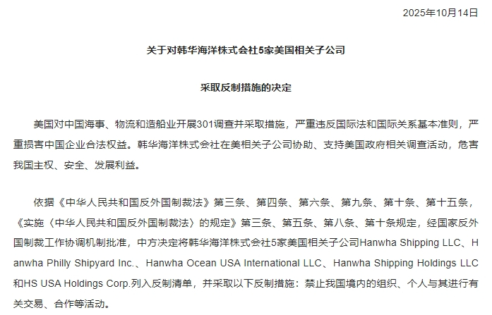 5. 中国对韩华美国子公司的制裁非常严厉,商务部10月14日原文:“禁止中国境内的组织、个人与其进行有关交易、合作等活动”,没有“许可证豁免”或“人道/维修例外”条款,也没有设截止期。这是说,所有中国公司,连在华外资公司都在内,不得向这5家美国子公司出售任何商品、零部件、软件或提供服务;不能采购它们的产品或技术,连中介、货运、结算、维修、技术交流都被一刀切。这几家公司买不到中国商品,卖也卖不进来。
